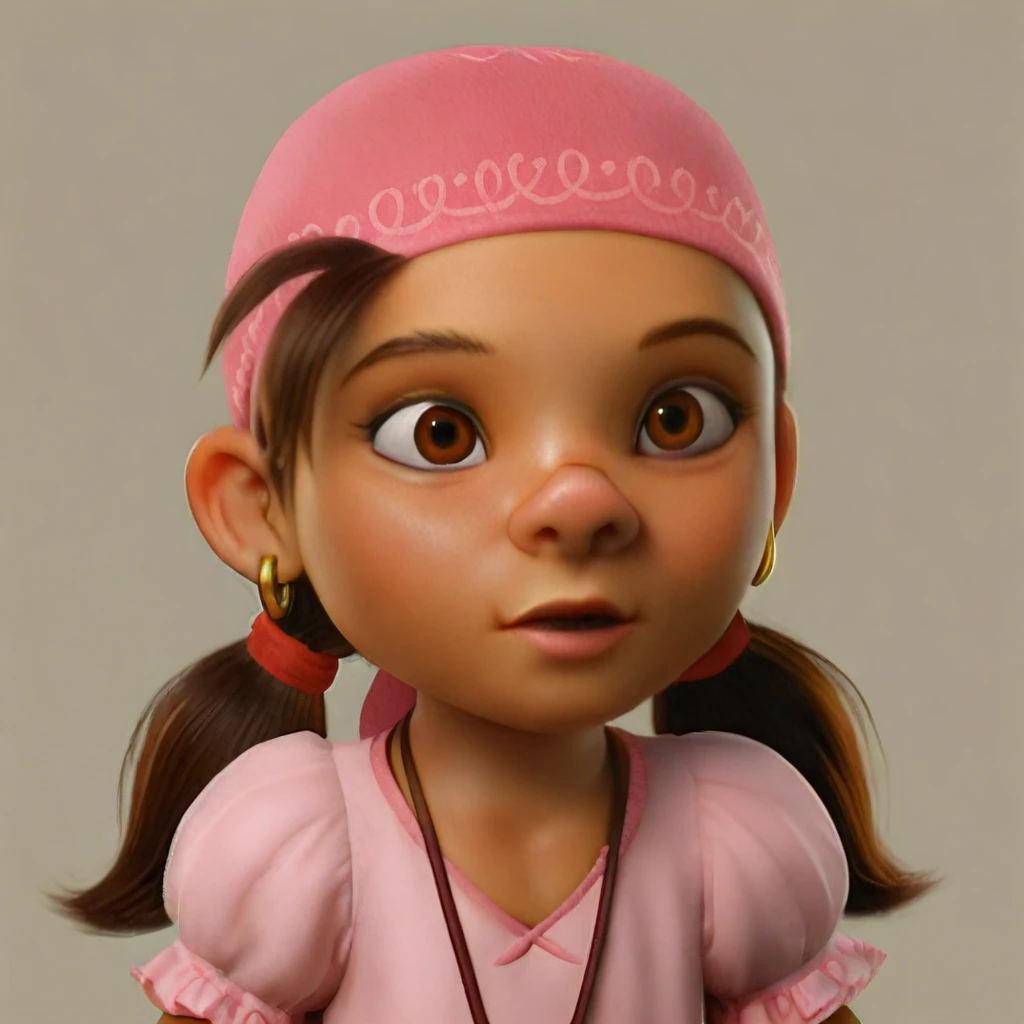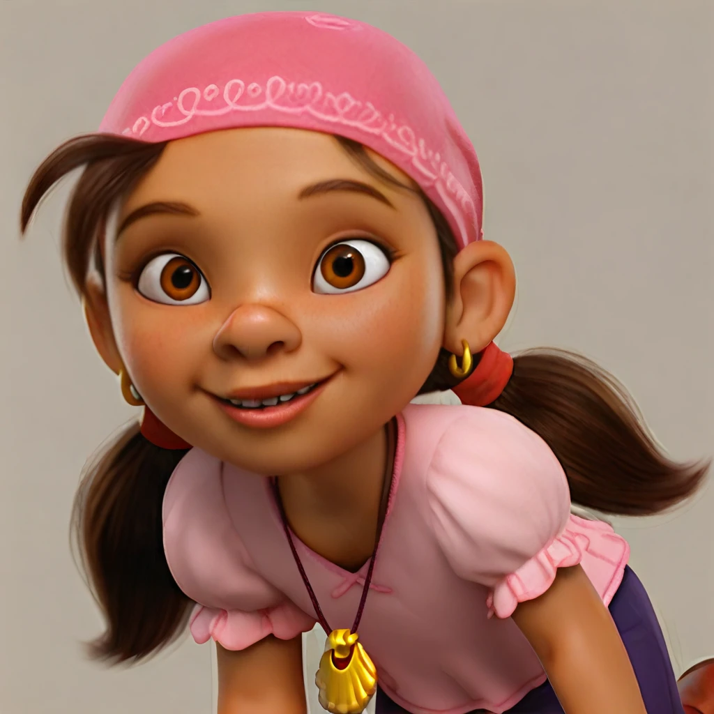 1girl, solo, short downward pigtails, extremely upturned nose, wide nose, visible nostrils, extremely concave nose bridge, dark brown hair, perfect teeth, brown eyes, realistic eyes, realistic, pink bandana, pink short sleeve shirt, yellow scallop necklace, small gold earrings, red hair ties, dark purple pants, brown boots,