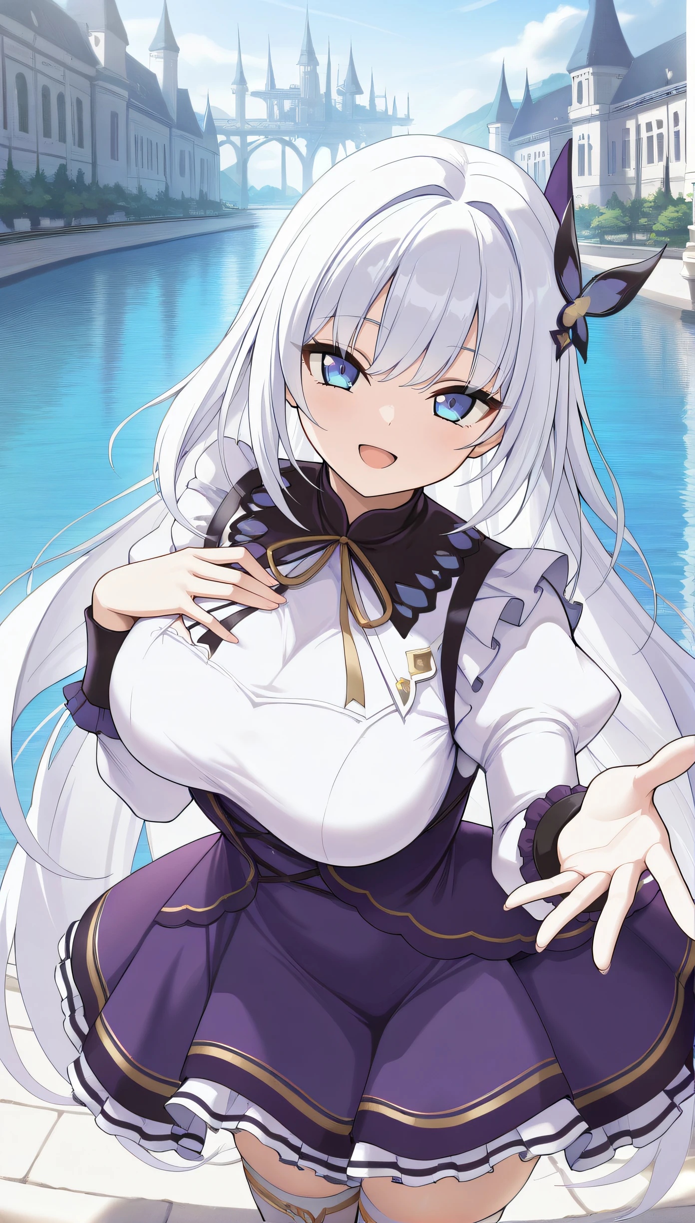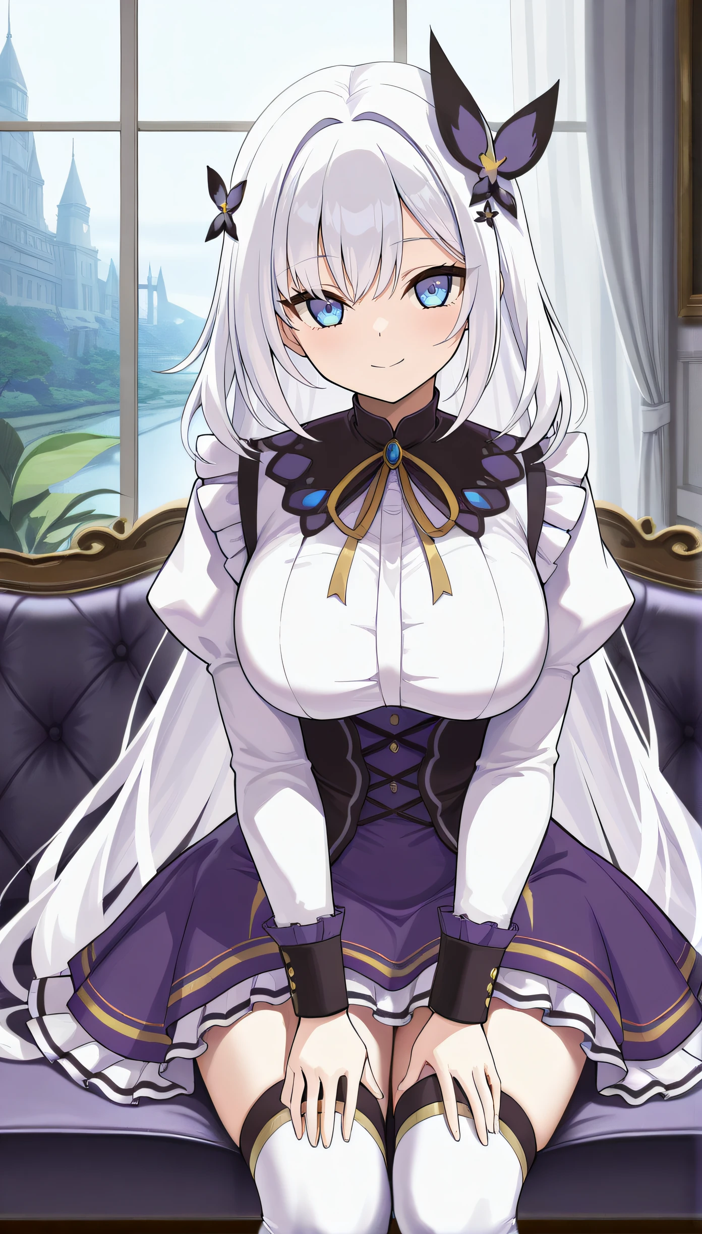 ran, white hair, very long hair, blue eyes, frills, puffy sleeves, purple dress, large breasts, white chest, white long sleeves, white thighhighs, black heels