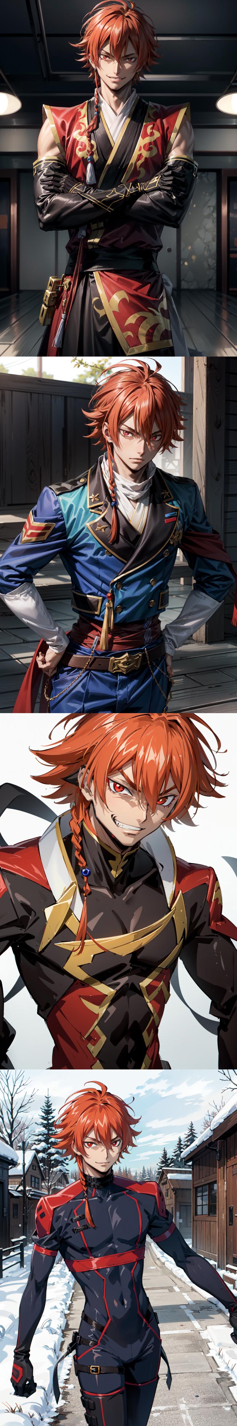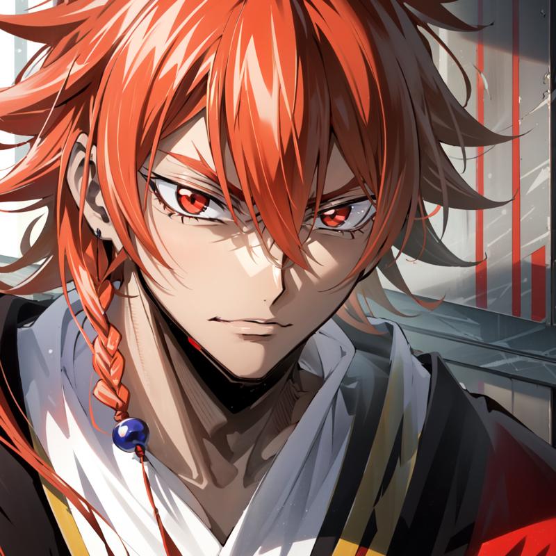 BASE PROMPT: ashley ashura\(akito the exiled\), 1boy, orange hair, hair between eyes, red eyes,