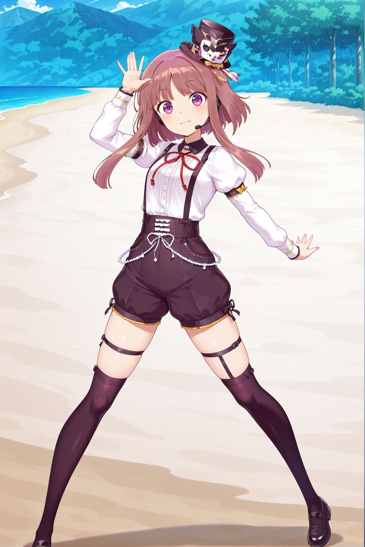 nishida satono, 1girl, solo, purple eyes, brown hair, short hair with long locks,, nishida satono \(the all-too-dark backup dancers\), alternate costume, alternate headwear, black hat, top hat, mask on hat, headset, red neck ribbon, white shirt, long sleeves, juliet sleeves, black suspenders, pearl belt, black shorts, black thighhighs, thigh strap, black shoes,