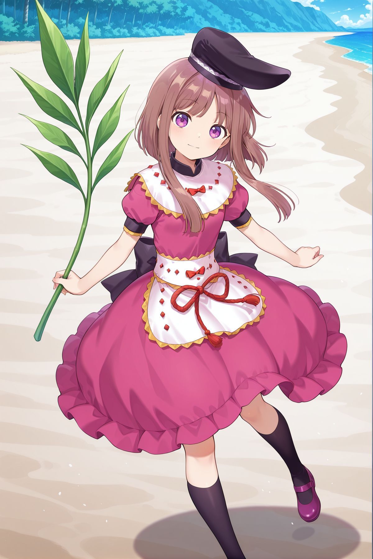 black hat, tate eboshi, red bowtie, red ribbon, white capelet, purple dress, puffy short sleeves, waist apron, white apron, back bow, black bow, kneehighs, mary janes, purple shoes,