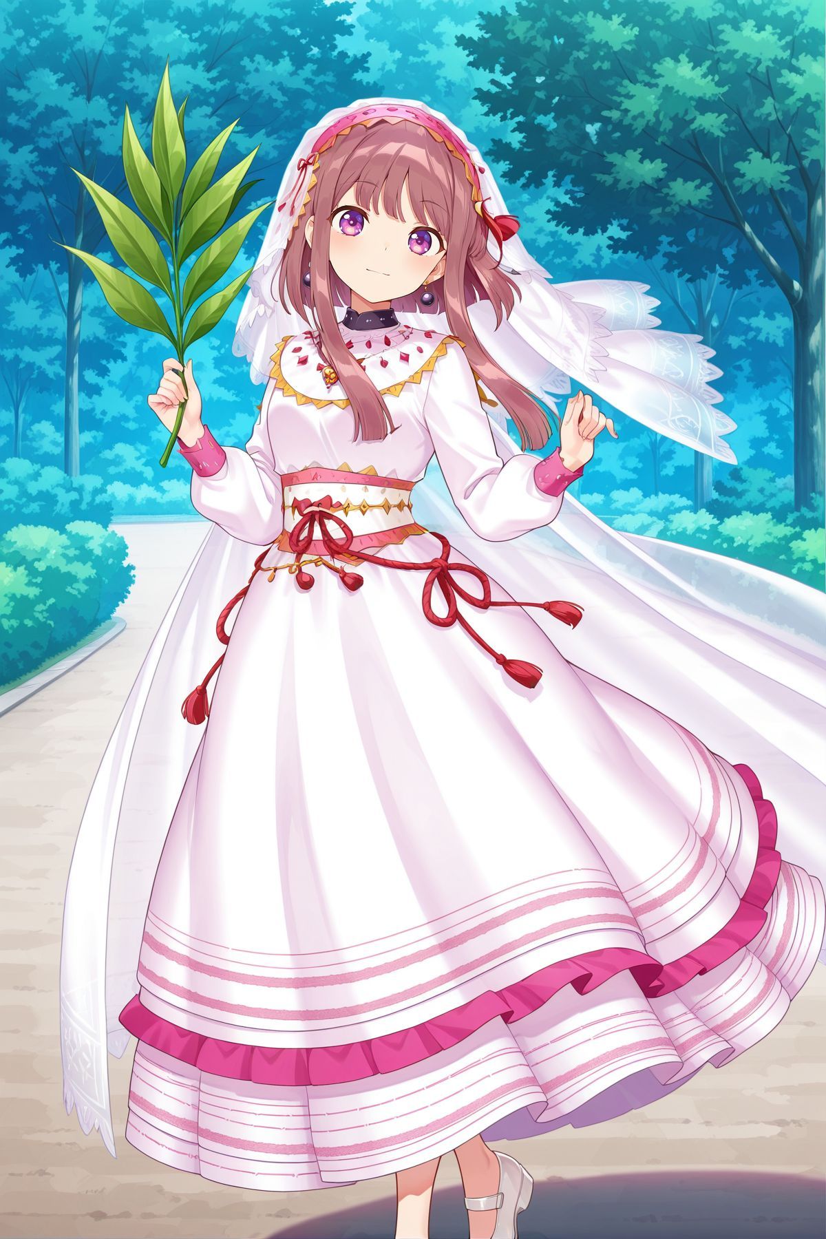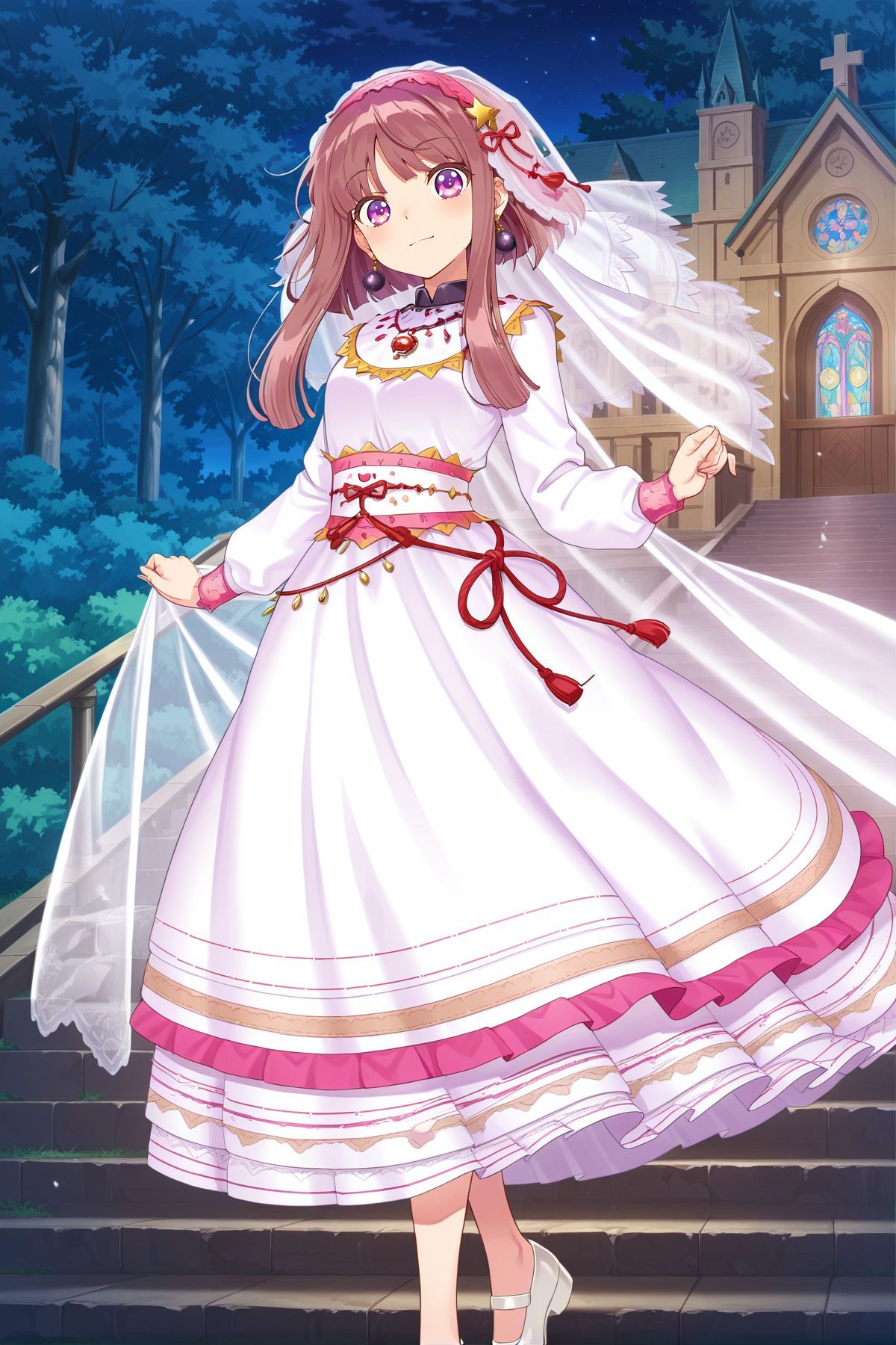 nishida satono, 1girl, solo, purple eyes, brown hair, short hair with long locks,, nishida satono \(white ginger nishita-douji\), alternate costume, bridal veil, hair ornament, pink hairband, earrings, see-through cape, necklace, pendant, white dress, wedding dress, long sleeves, white sash, gold trims, white skirt, white shoes,