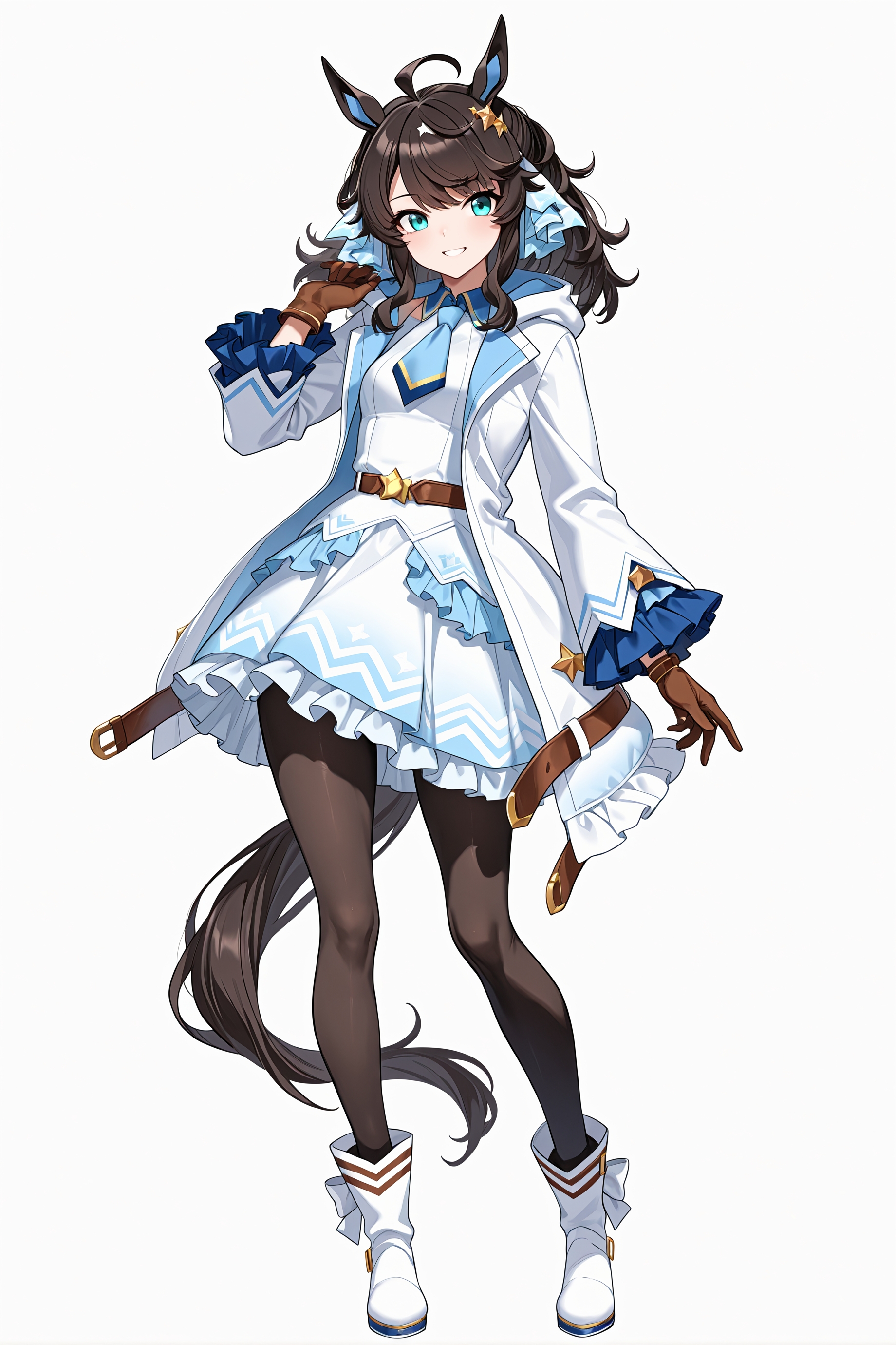 daring tact \(umamusume\), horse tail, horse ears, horse girl, ponytail, star hair ornament, gloves, necktie, jacket, pantyhose, dress, ankle boots, belt,