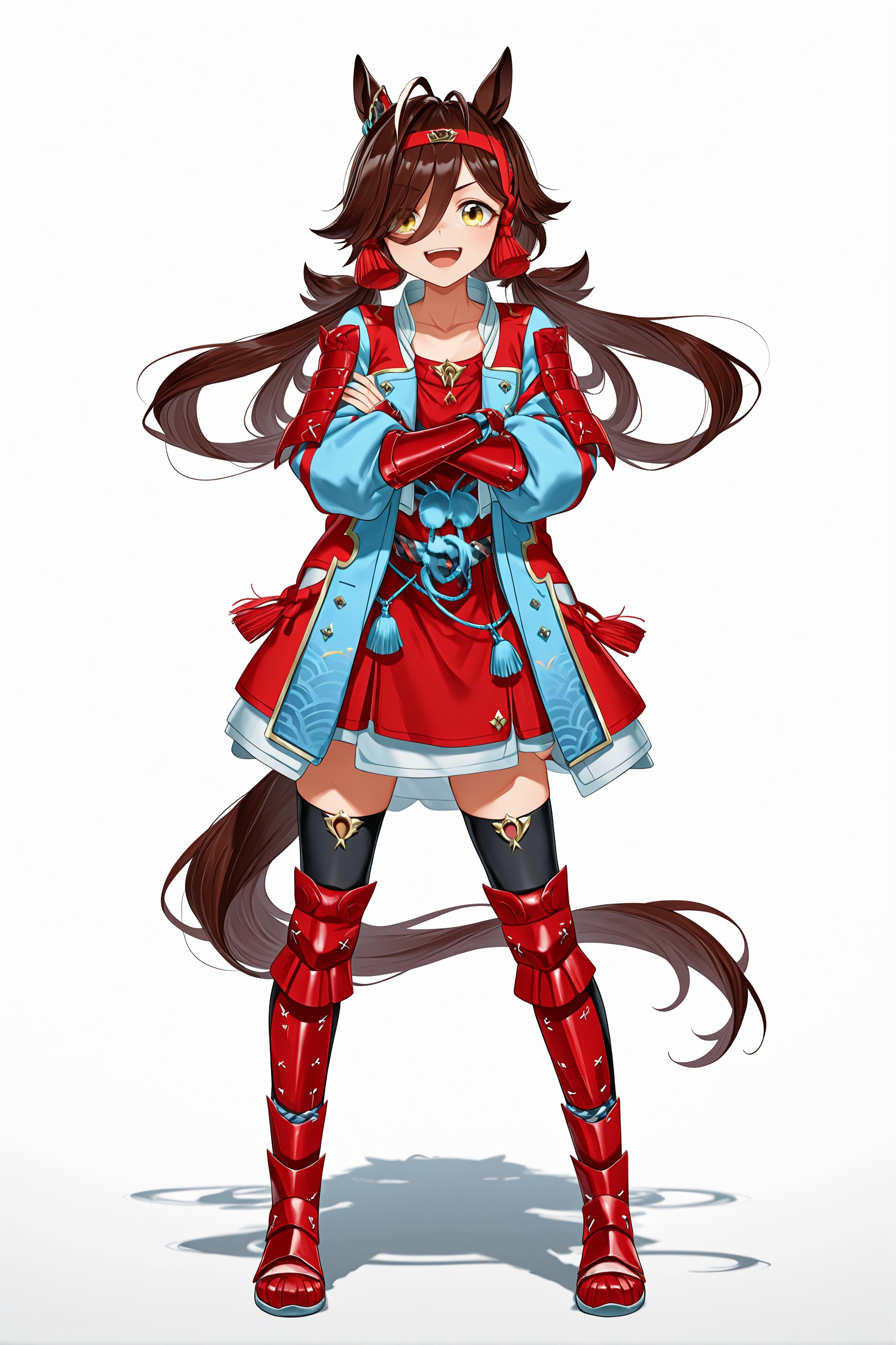 red japanese armor, red dress, blue rope, kote, blue jacket, japanese clothes, black thighhighs, leg armor,