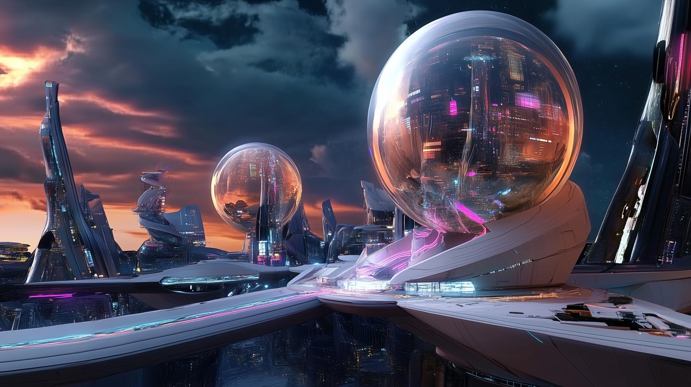 Most of the Architecture is rounded and futuristic with neons, crystals, galactic skies..
