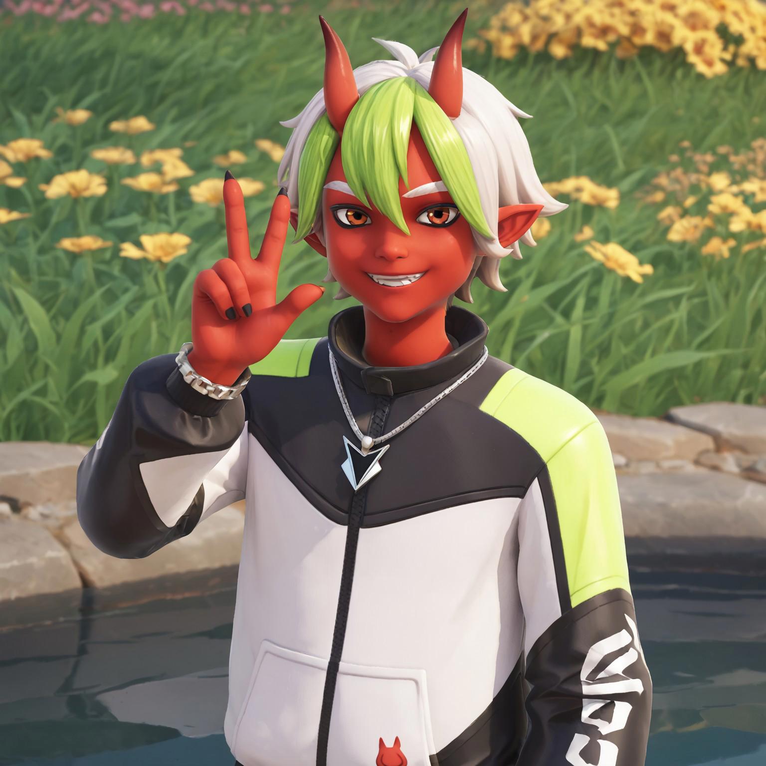 skinny, black shorts, red skin, bandage on tail, 1boy, shorts with white writing, jewelry, looking at viewer, demon boy, multicolored hair, demon tail, shorts, green and white hair, red horns, pointy ears, colored skin, horns, solo, jacket, male focus, jacket with green on shoulders, necklace, silver bracelet