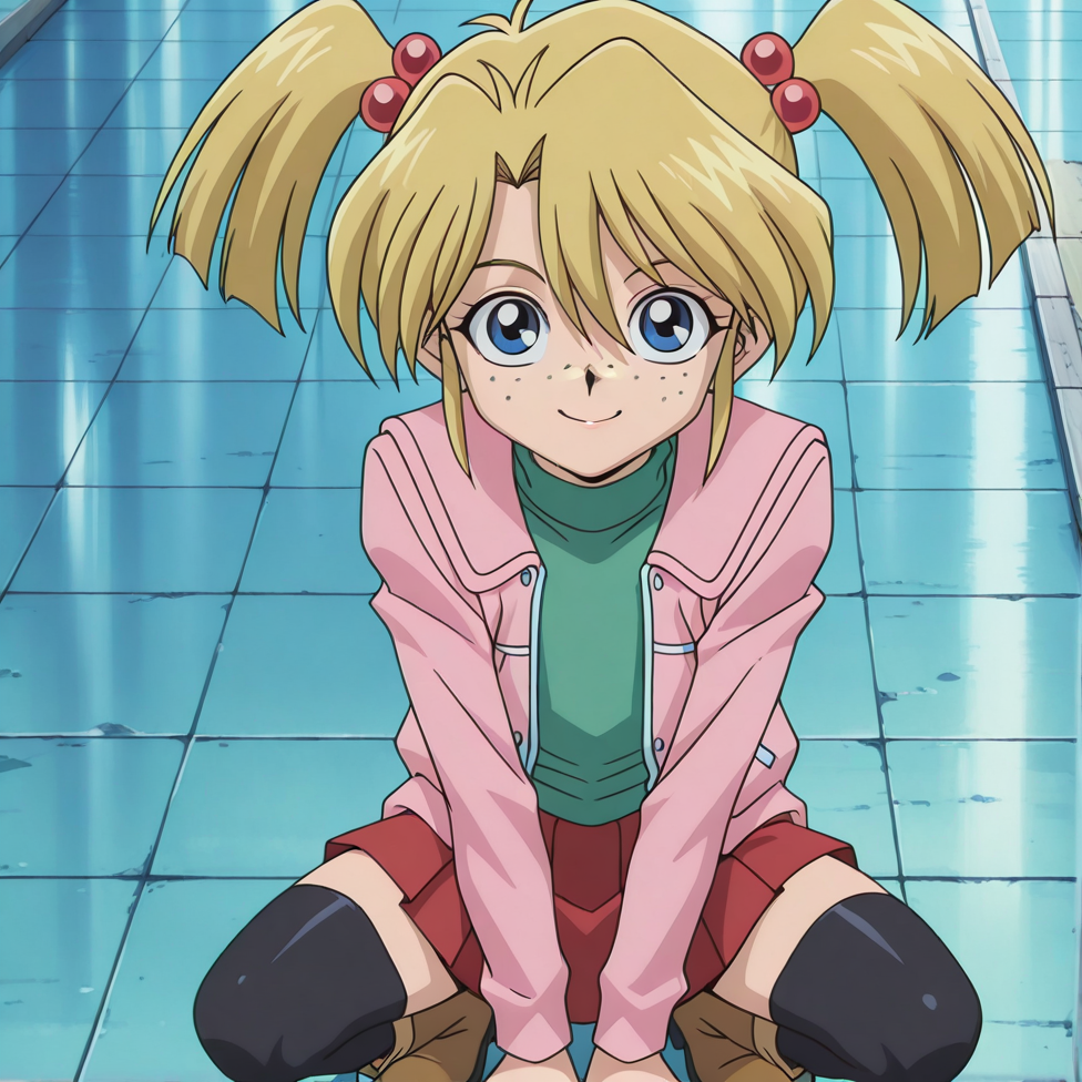 twintails, hair bobbles, pink jacket, long sleeves, green turtleneck, red skirt, pleated skirt, black thighhighs, boots