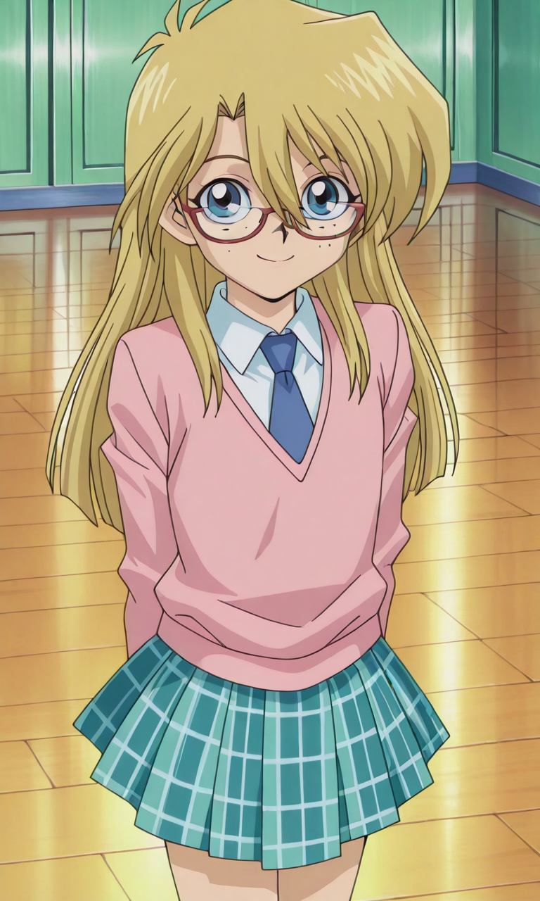 long hair, hair between eyes, glasses, semi-rimless eyewear, red-framed eyewear, pink sweater, jacket, white collared shirt, blue necktie, teal skirt, plaid skirt, socks, brown footwear, loafers