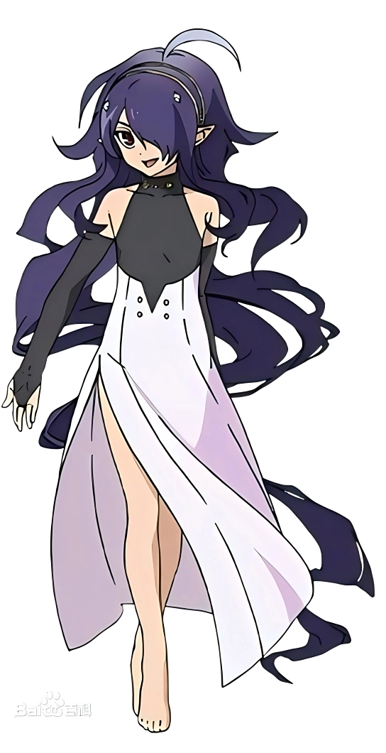 ahoge,very long hair,purple hair,yellow hairband,pointy ears,hair over one eye,red eyes