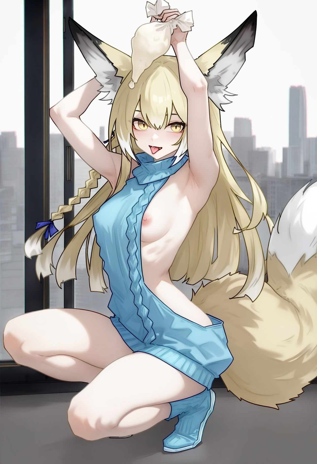 Izuna (blue archive) fox girl with brown hair, yellow eyes, hair flower stands on the right. She also wears maid uniform, she is lifting the hem of her skirt showing that she wears no panties. blushing, ashamed