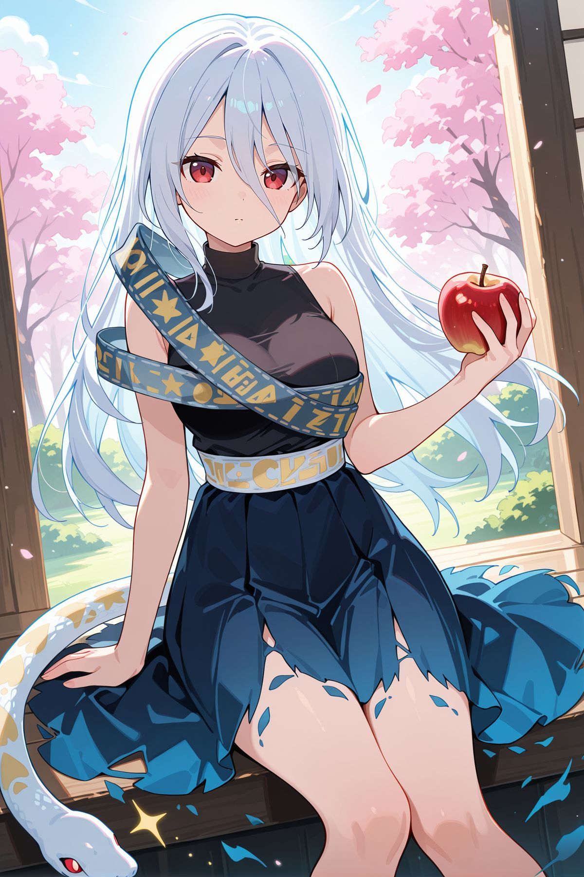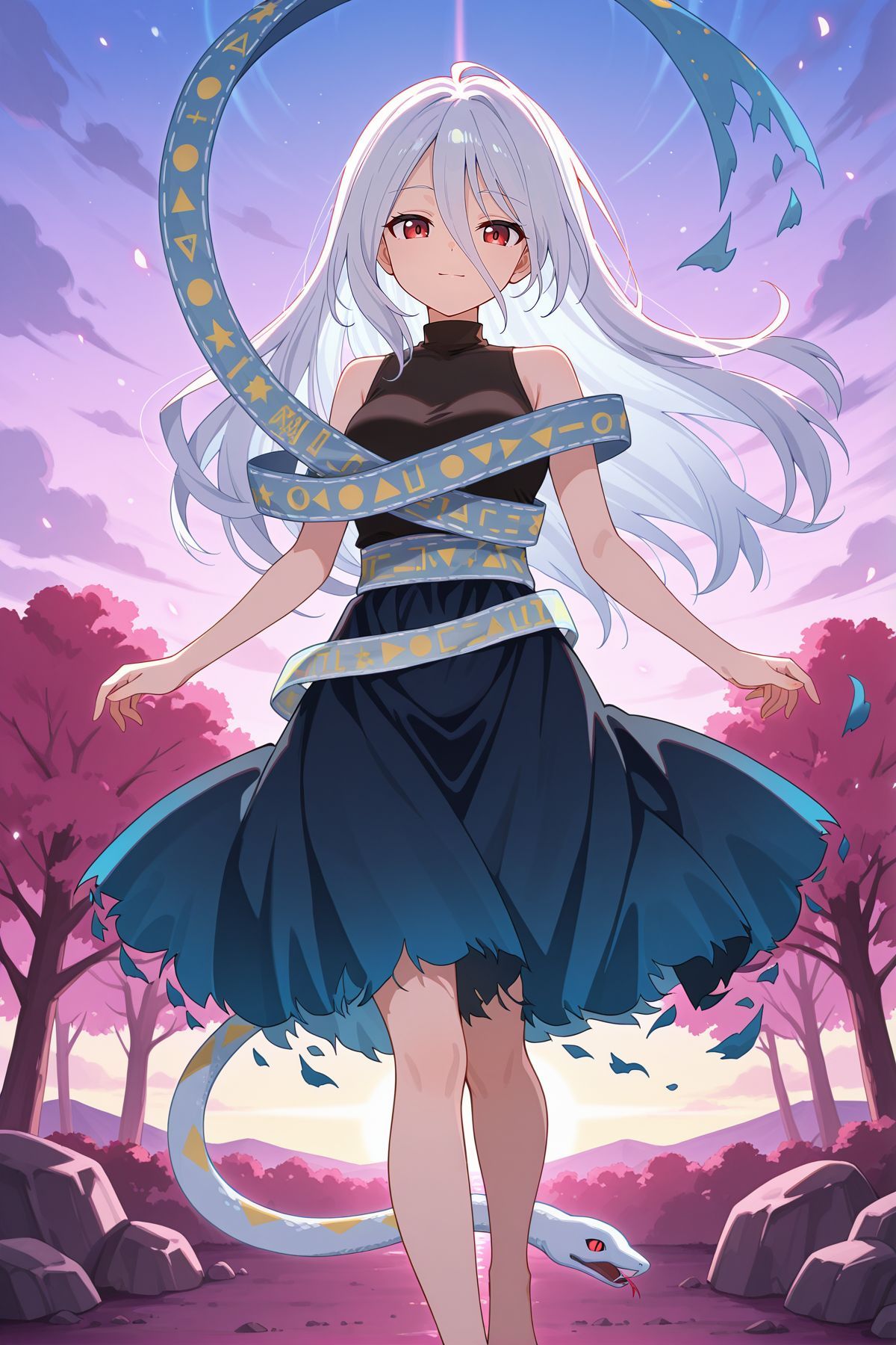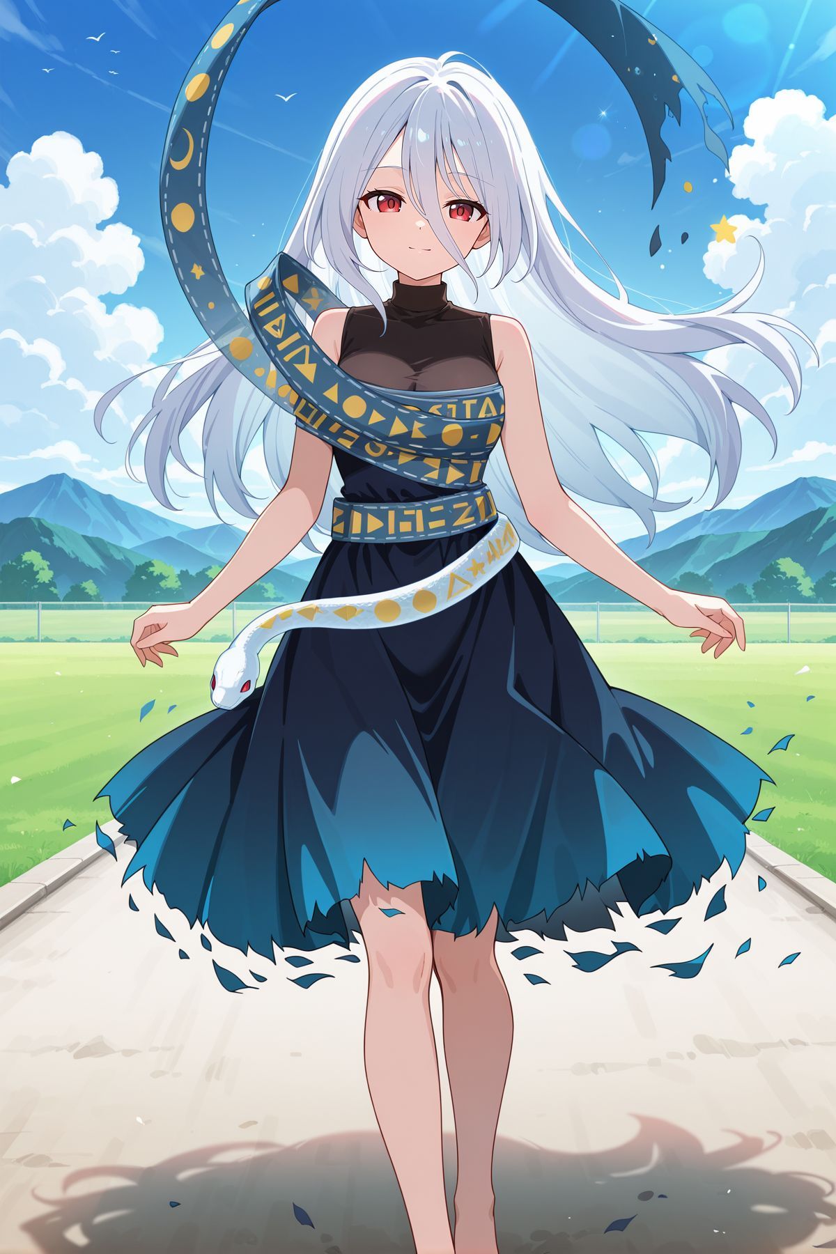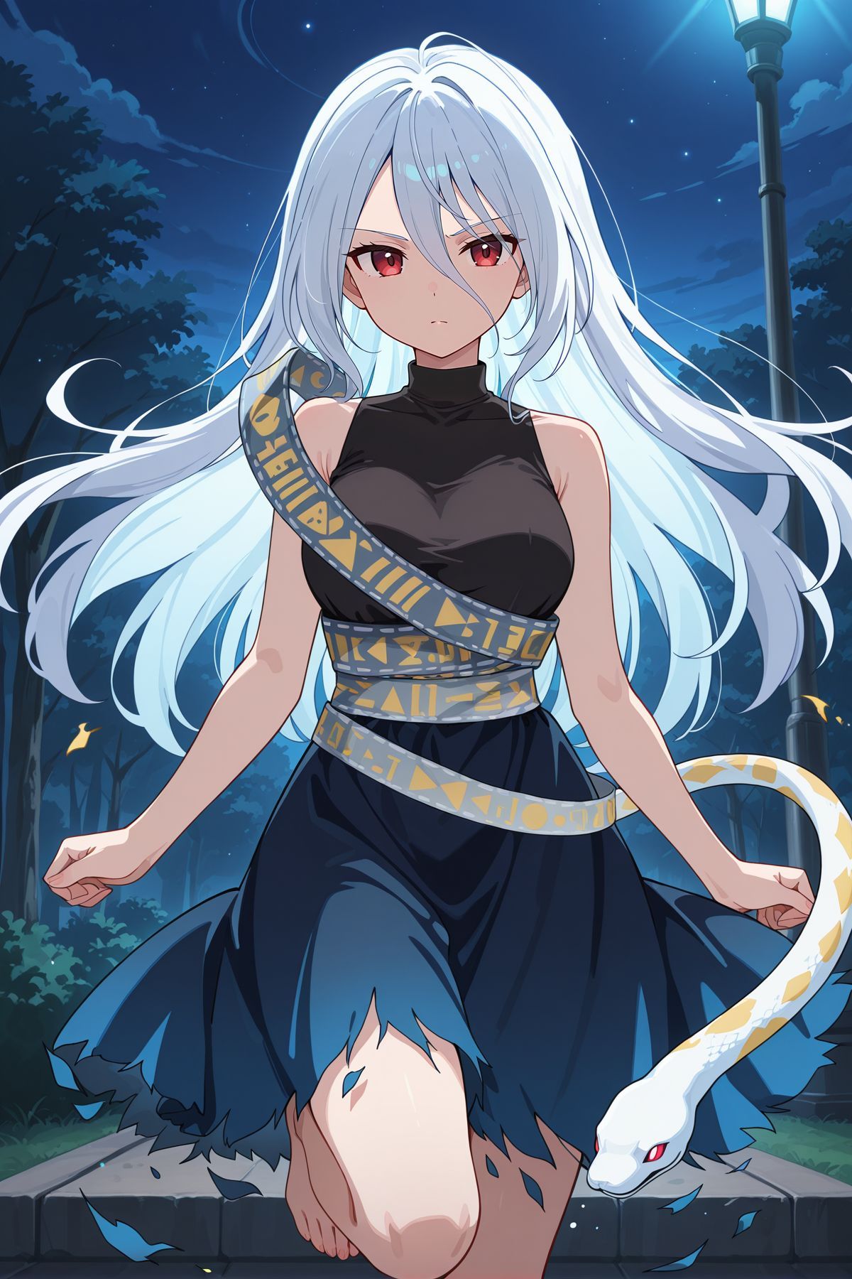 turtleneck dress, gradient dress, black dress, blue skirt, torn skirt, sleeveless dress, shoulder sash, torn sash, print sash, white snake, barefoot,