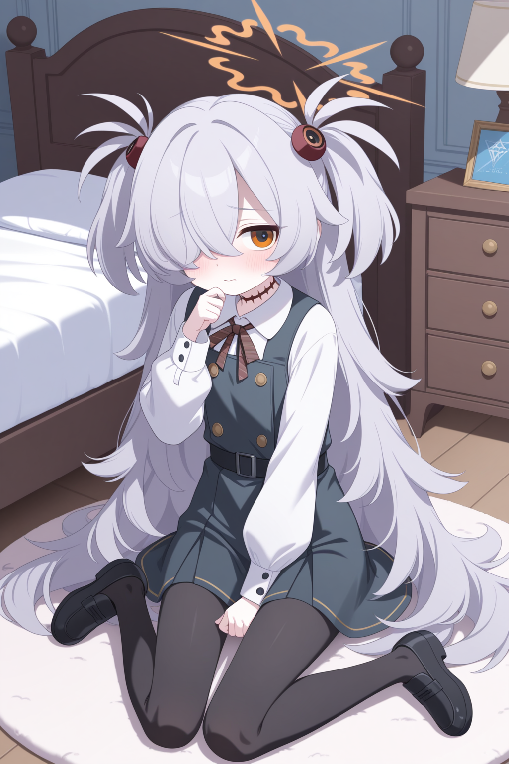 kanoe (blue archive), 1girl, solo, silver hair, very long hair, twintails, hair over one eye, amber eyes, halo, neck stitches, choker, striped neckwear, white shirt, collared shirt, long sleeves, double-breasted jumper dress, belt, black pantyhose, black footwear,