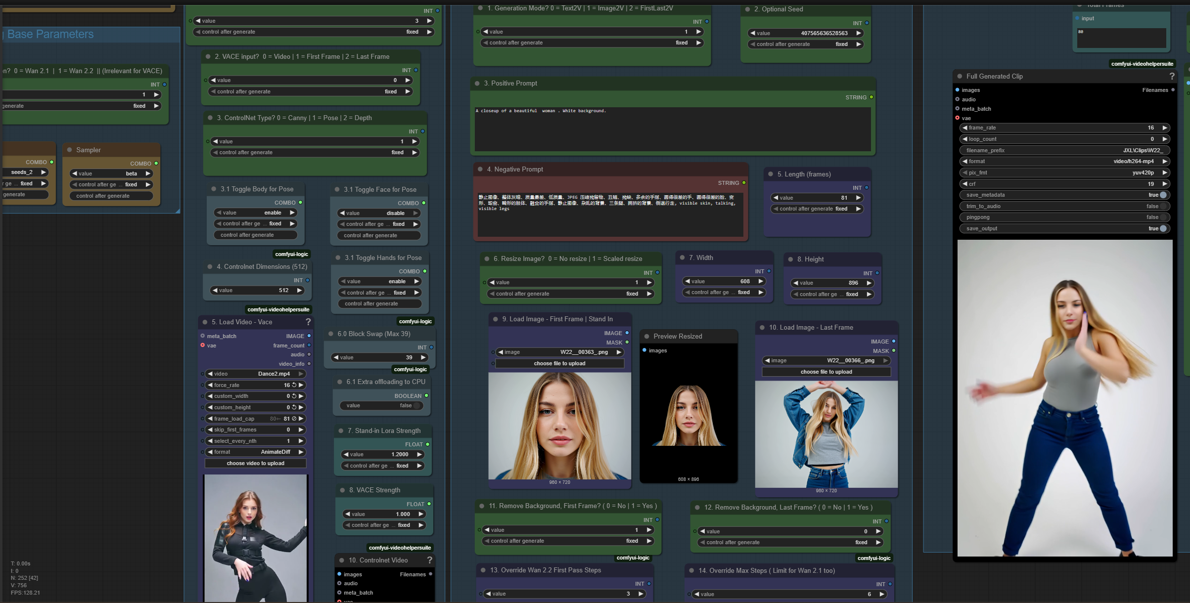 Allows for Wan 2.1, Wan 2.1 Vace + Stand-In (any combination), and Wan 2.2 Generation inside the same workflow. Canny, Pose (Face, Body, Hands) and Depth can be toggled with a single switch (!))