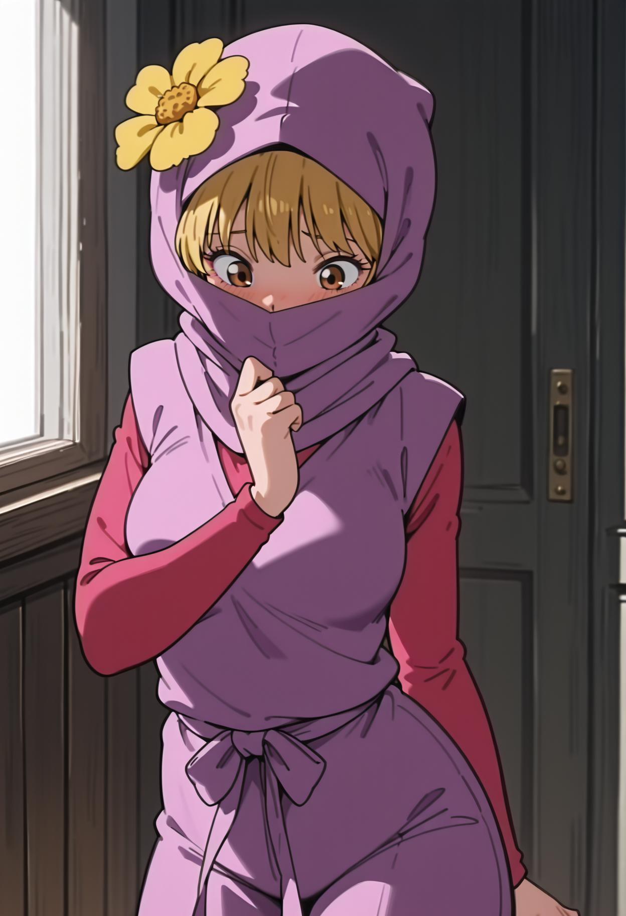Outfit 2: mk3o, 1girl, solo, ninjasuit, sleeveless dress, long sleeve shirt, waist belt, ribbon, covering mouth, hood, flower in hair, scarf, large breasts