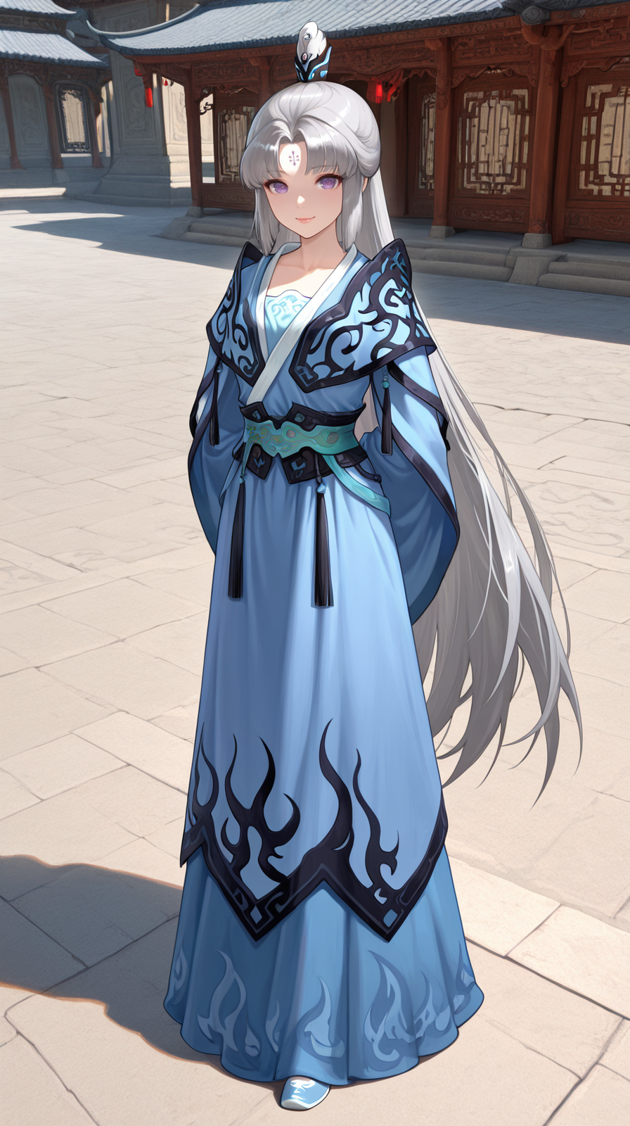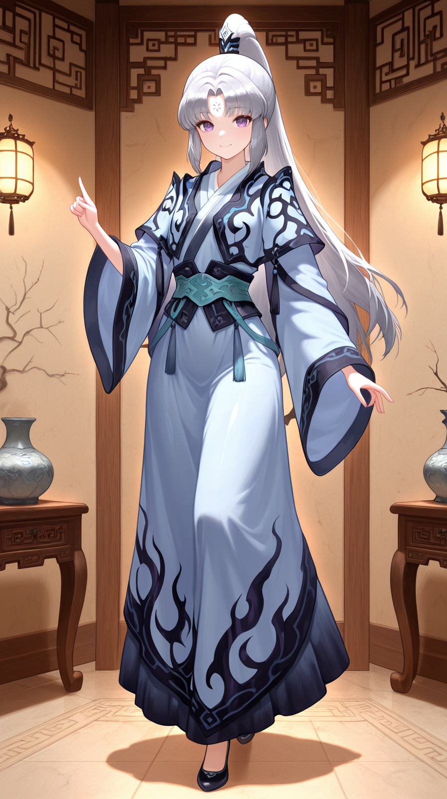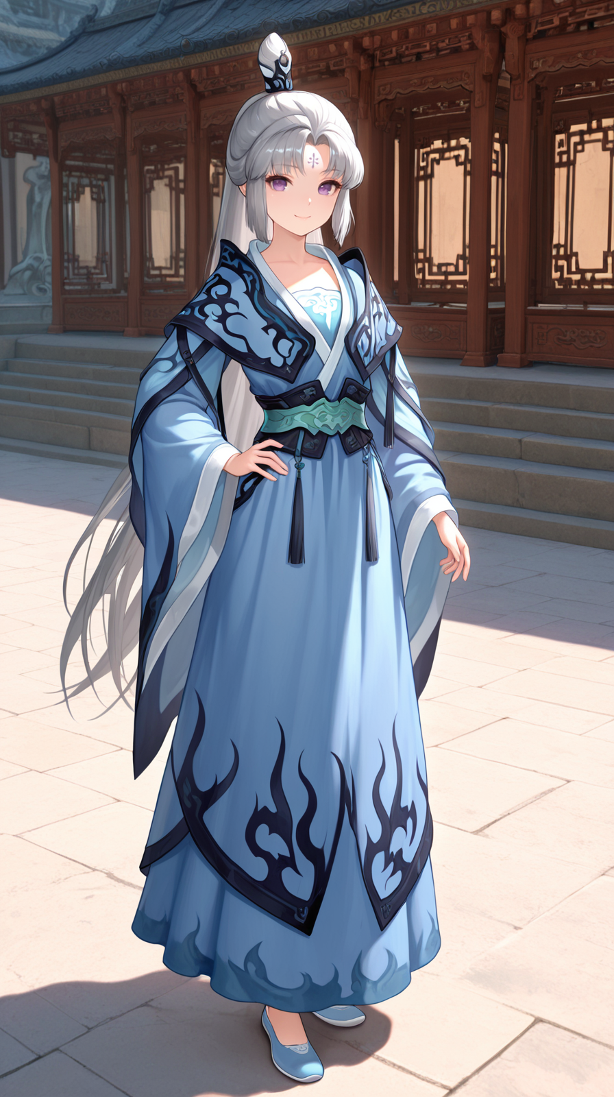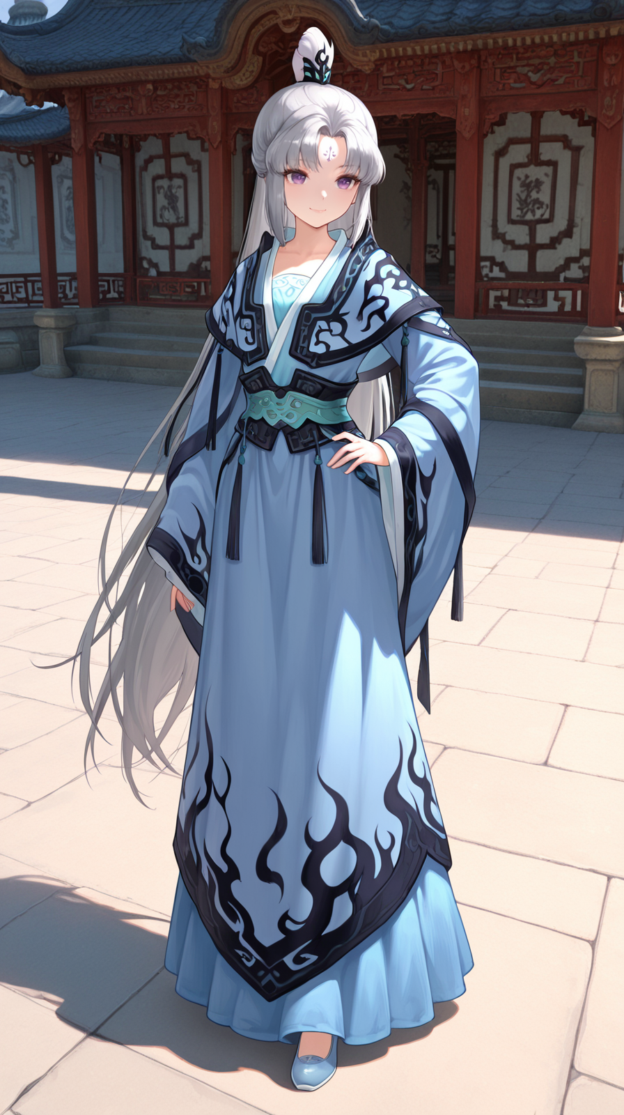 caogu, 1girl, solo, long hair, purple eyes, very long hair, forehead mark, ponytail, wide sleeves, white background, chinese clothes, full body, hanfu, dress, grey hair, hand on hip, smile, standing, hair ornament, sash, long sleeves, petite body, china shoes, parted bangs