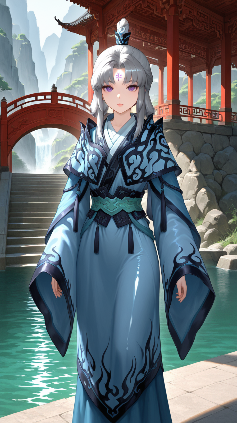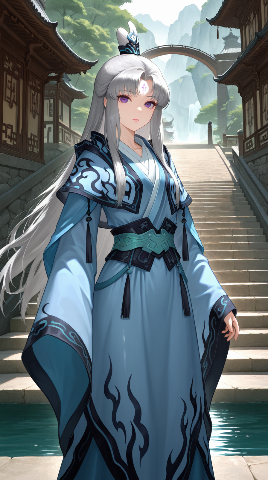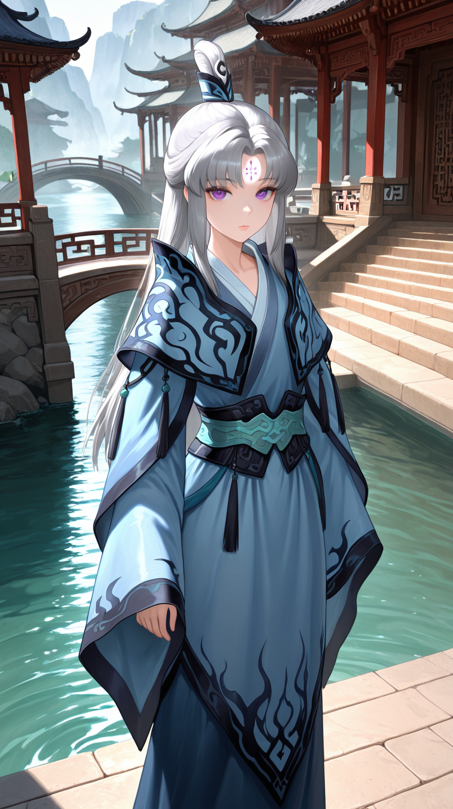 caogu, 1girl, solo, forehead mark, long sleeves, facial mark, looking at viewer, water, purple eyes, bridge, standing, blue dress, sash, expressionless, sidelocks, outdoors, grey hair, dress, stairs, chinese clothes, petite body, lips, wide sleeves