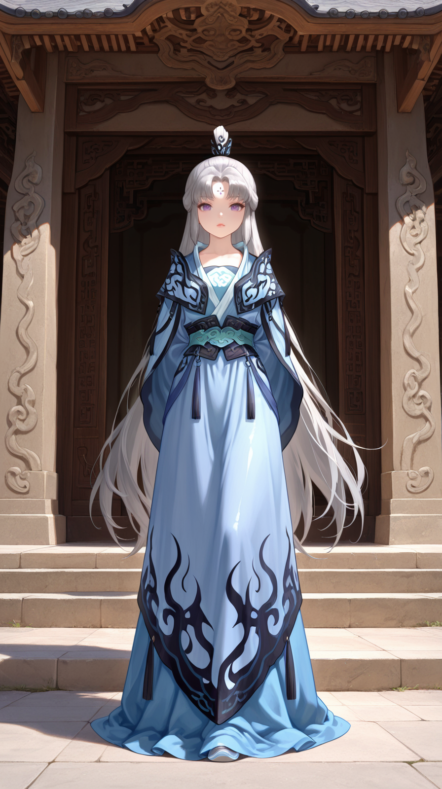 caogu, 1girl, purple eyes, solo, forehead mark, chinese clothes, facial mark, looking at viewer, long sleeves, standing, sleeves past wrists, white hair, hanfu, grey hair, petite body, lips, wide sleeves
