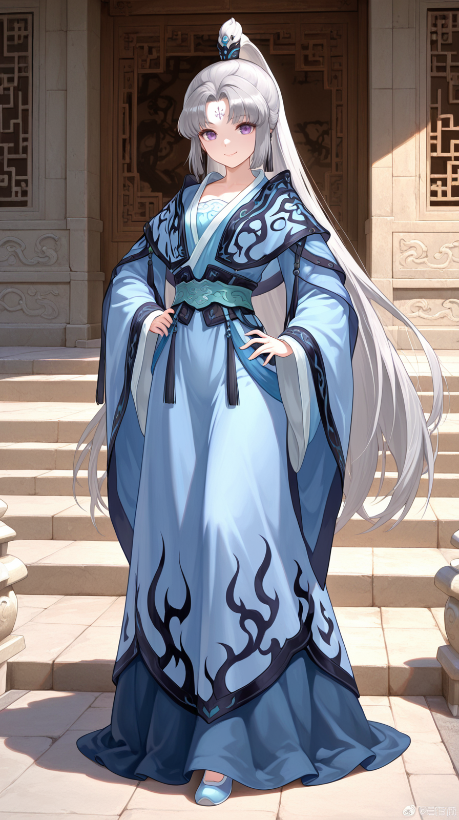 caogu, 1girl, solo, long hair, purple eyes, very long hair, forehead mark, ponytail, wide sleeves, white background, chinese clothes, full body, hanfu, dress, grey hair, hand on hip, smile, standing, hair ornament, sash, long sleeves, petite body, china shoes