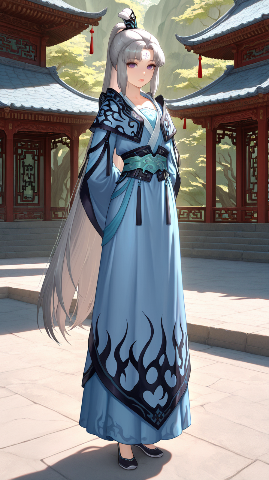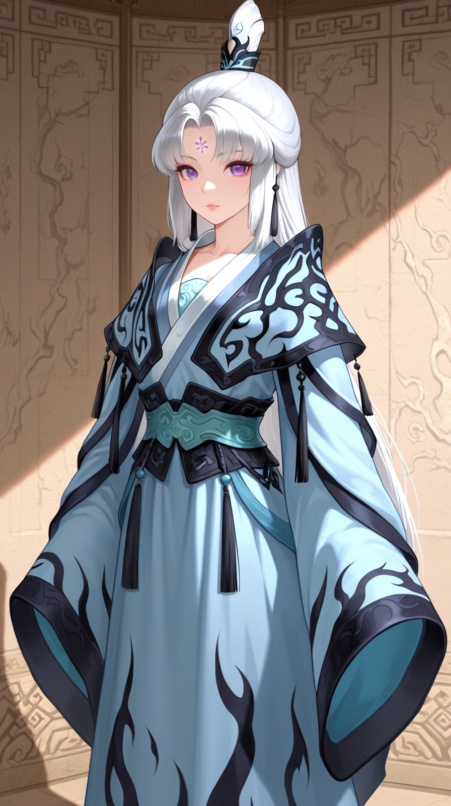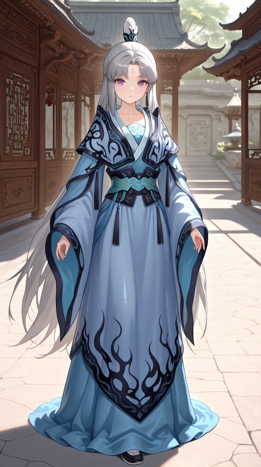 caogu, 1girl, purple eyes, solo, forehead mark, chinese clothes, facial mark, looking at viewer, long sleeves, standing, sleeves past wrists, white hair, hanfu, grey hair, petite body, lips, wide sleeves, parted bangs