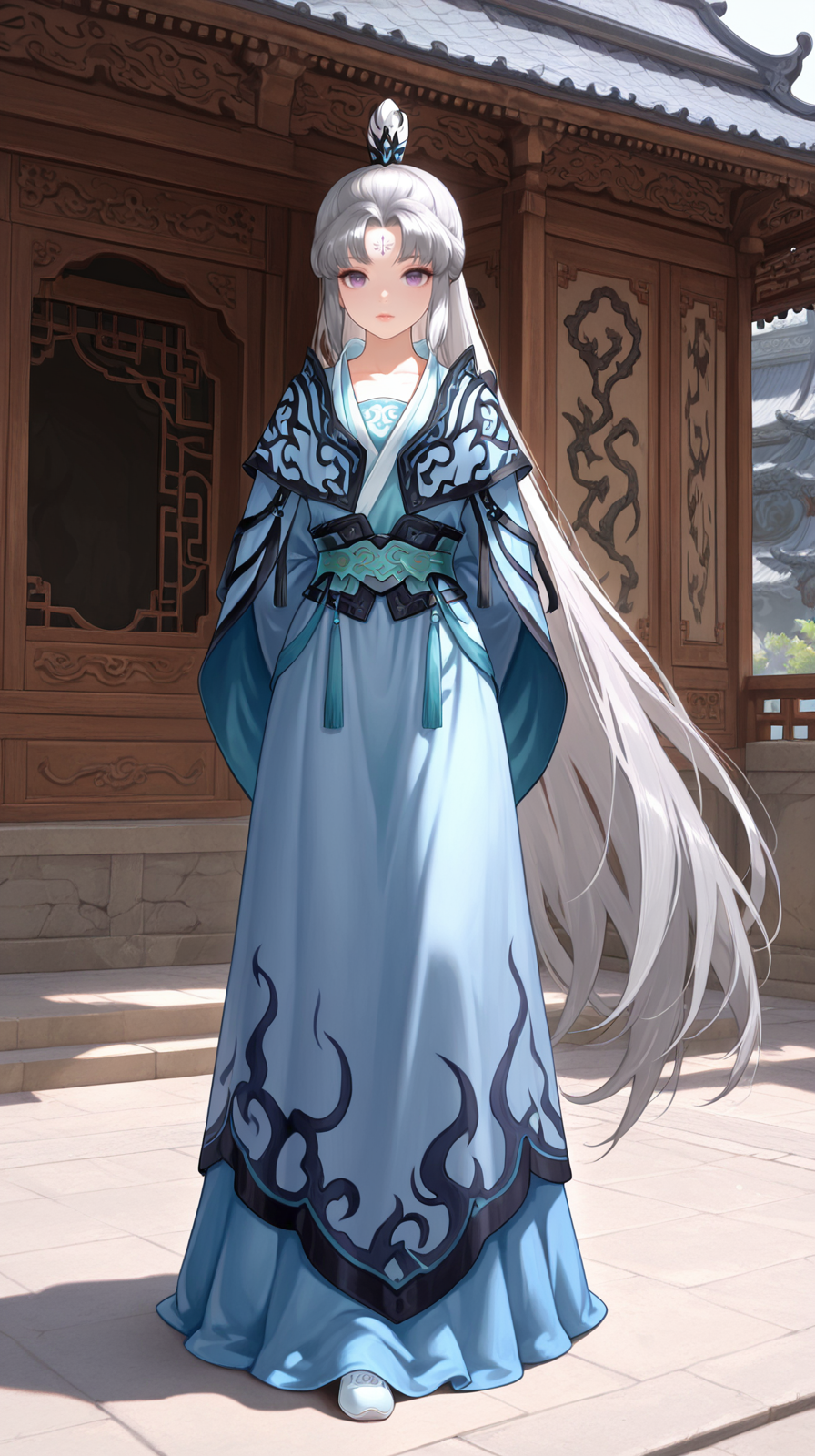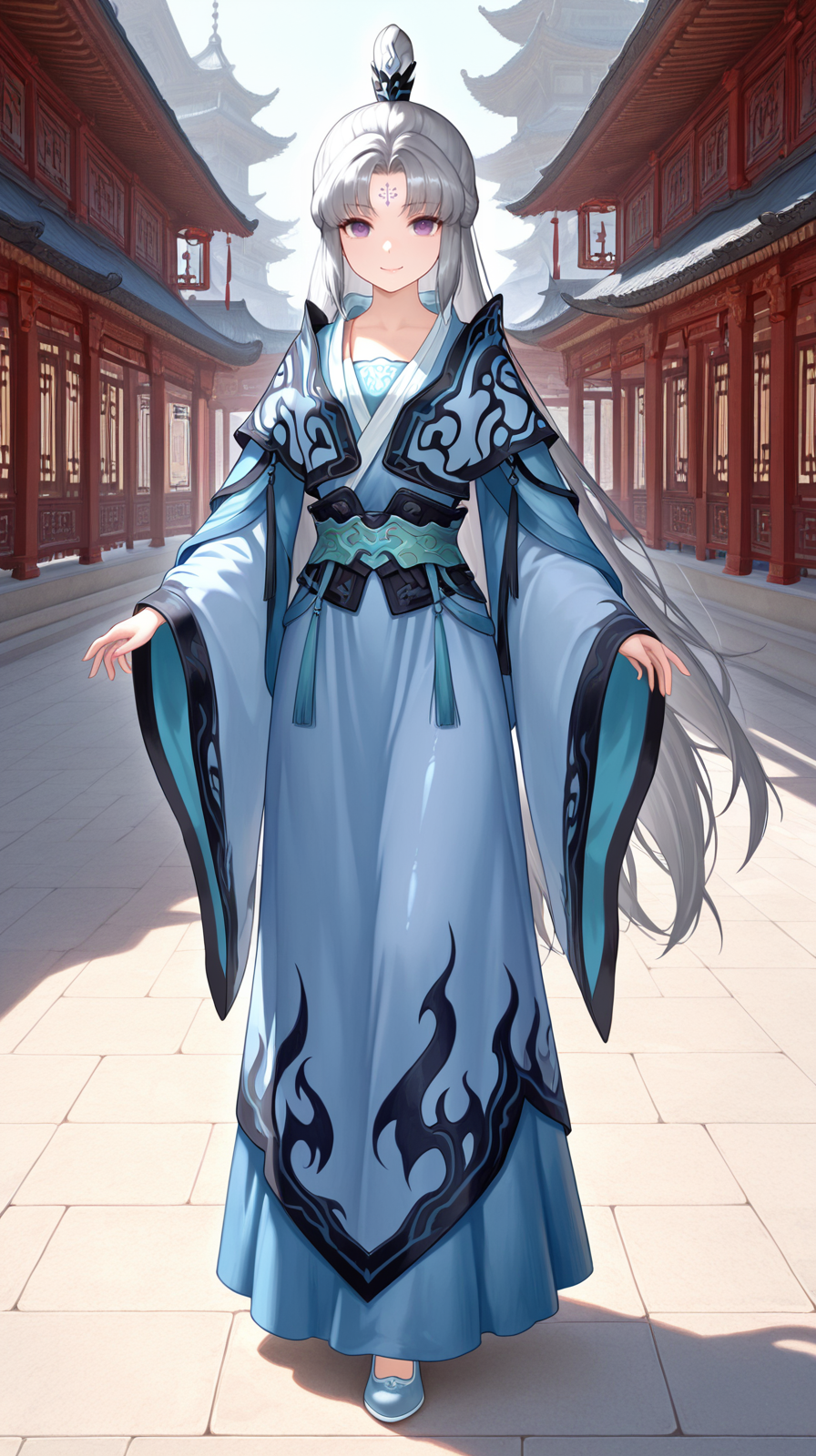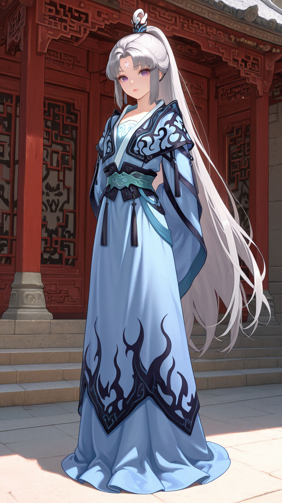 caogu, 1girl, purple eyes, solo, forehead mark, chinese clothes, facial mark, looking at viewer, long sleeves, standing, sleeves past wrists, white hair, hanfu, grey hair, petite body, lips, wide sleeves, parted bangs