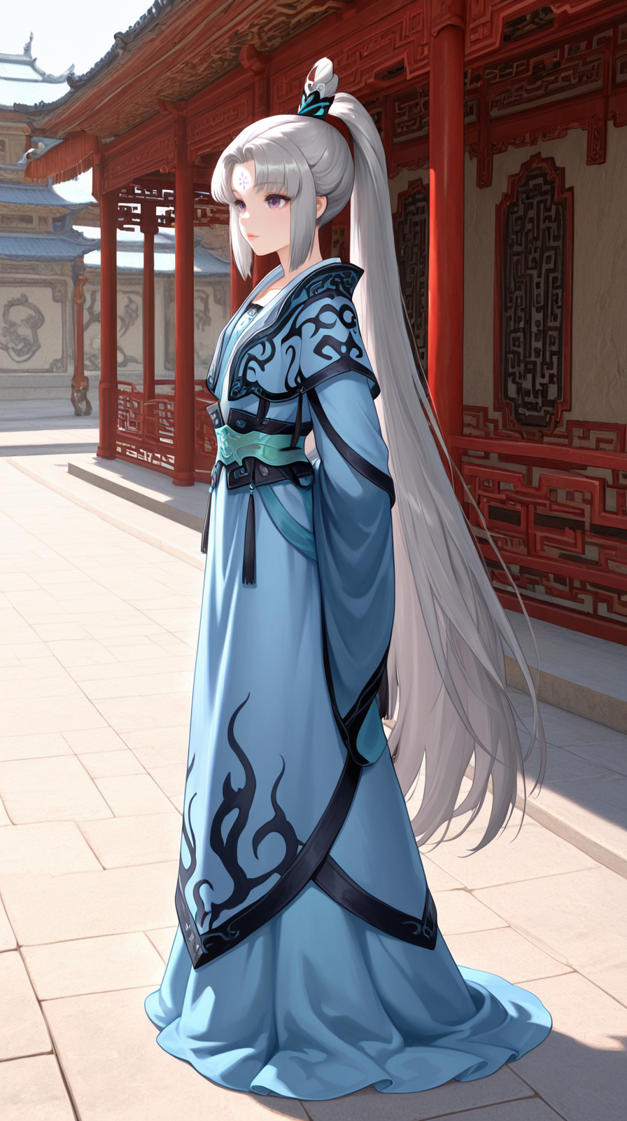 caogu, 1girl, solo, long hair, armor, standing, very long hair, dress, from behind, blue dress, veil, grey hair, full body, chinese clothes, petite body, high ponytail, china shoes, wide sleeves