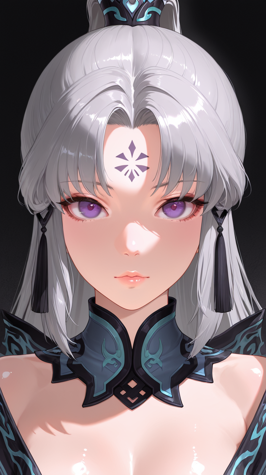 caogu, 1girl, solo, purple eyes, forehead mark, lips, facial mark, long hair, grey hair, hair ornament, ponytail, portrait, looking at viewer, chinese clothes, parted bangs