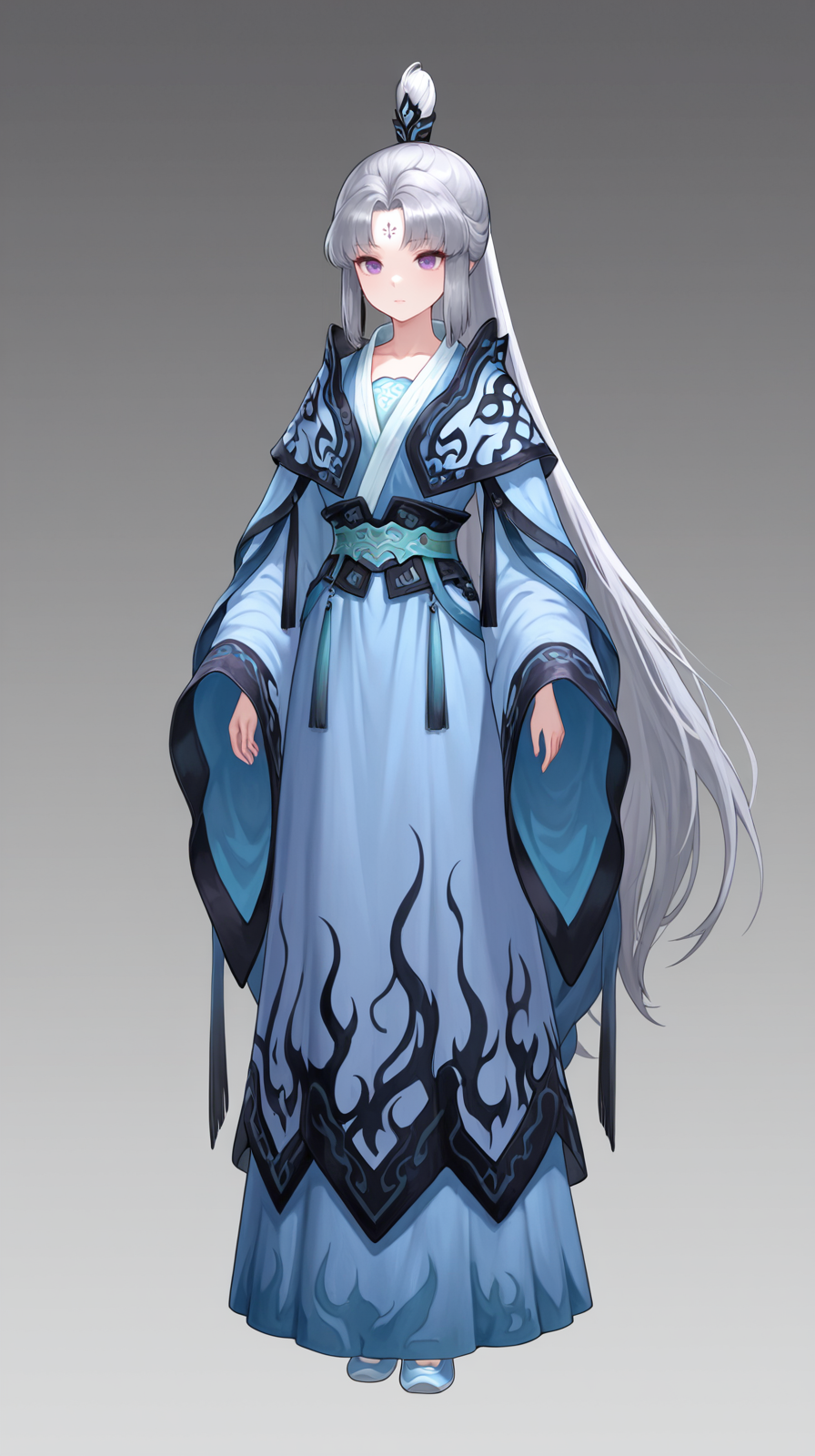 caogu, 1girl, solo, long hair, forehead mark, wide sleeves, very long hair, full body, long sleeves, purple eyes, standing, chinese clothes, grey background, sash, hanfu, jewelry, hair ornament, ponytail, grey hair, petite body, china shoes