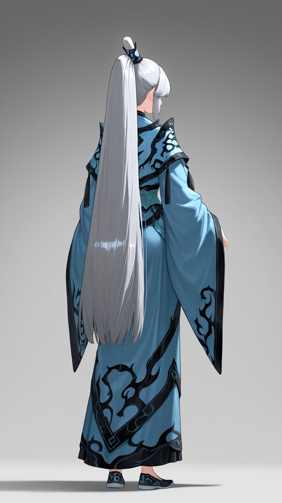 caogu, 1girl, solo, long hair, ponytail, from behind, facing away, grey background, wide sleeves, very long hair, grey hair, long sleeves, full body, standing, chinese clothes, petite body, china shoes