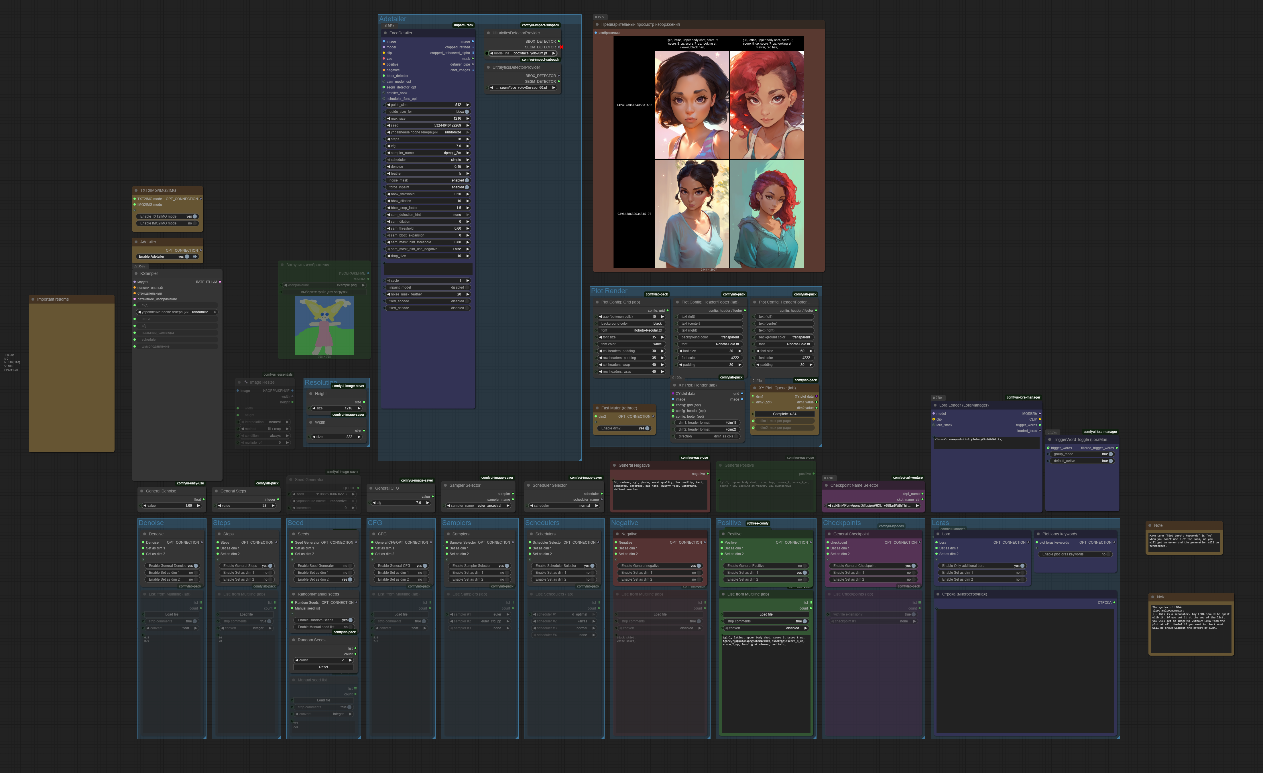 This XY plot is completely different from my own Simple XY Plot. I couldn’t find a way to connect adetailer to that extension, so I’m using the Comfylab extension in this new one as it’s the only tool that offers me that capability. The workflow is less “user‑friendly” then Simple XY Plot, but as I said it provides exactly what I need and has much more potential—especially for uncommon tasks. Before using it, please check out the README node in the workflow; some things are not obvious at first glance.