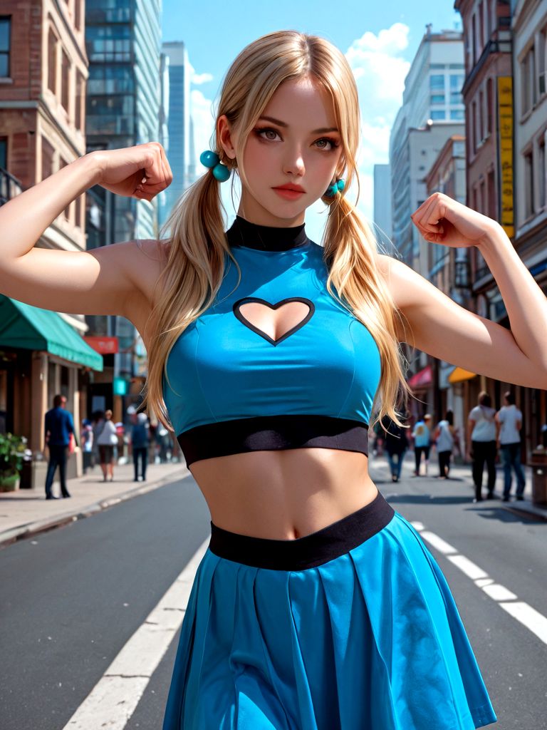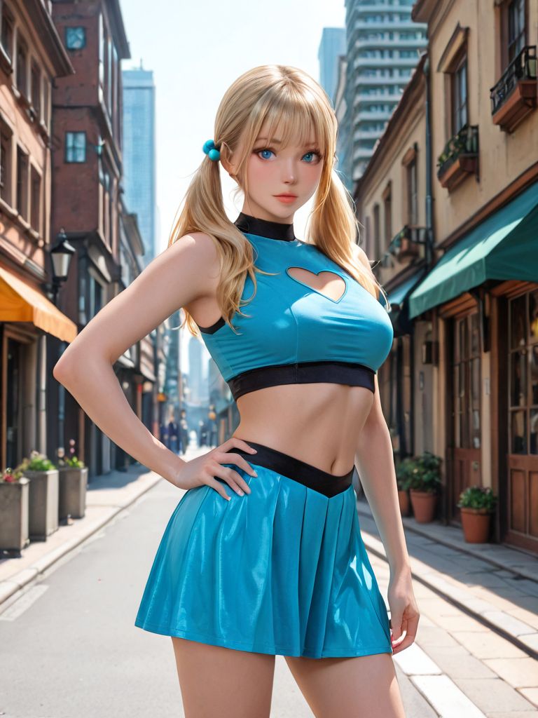 blue shirt, blue skirt, hair bobbles,