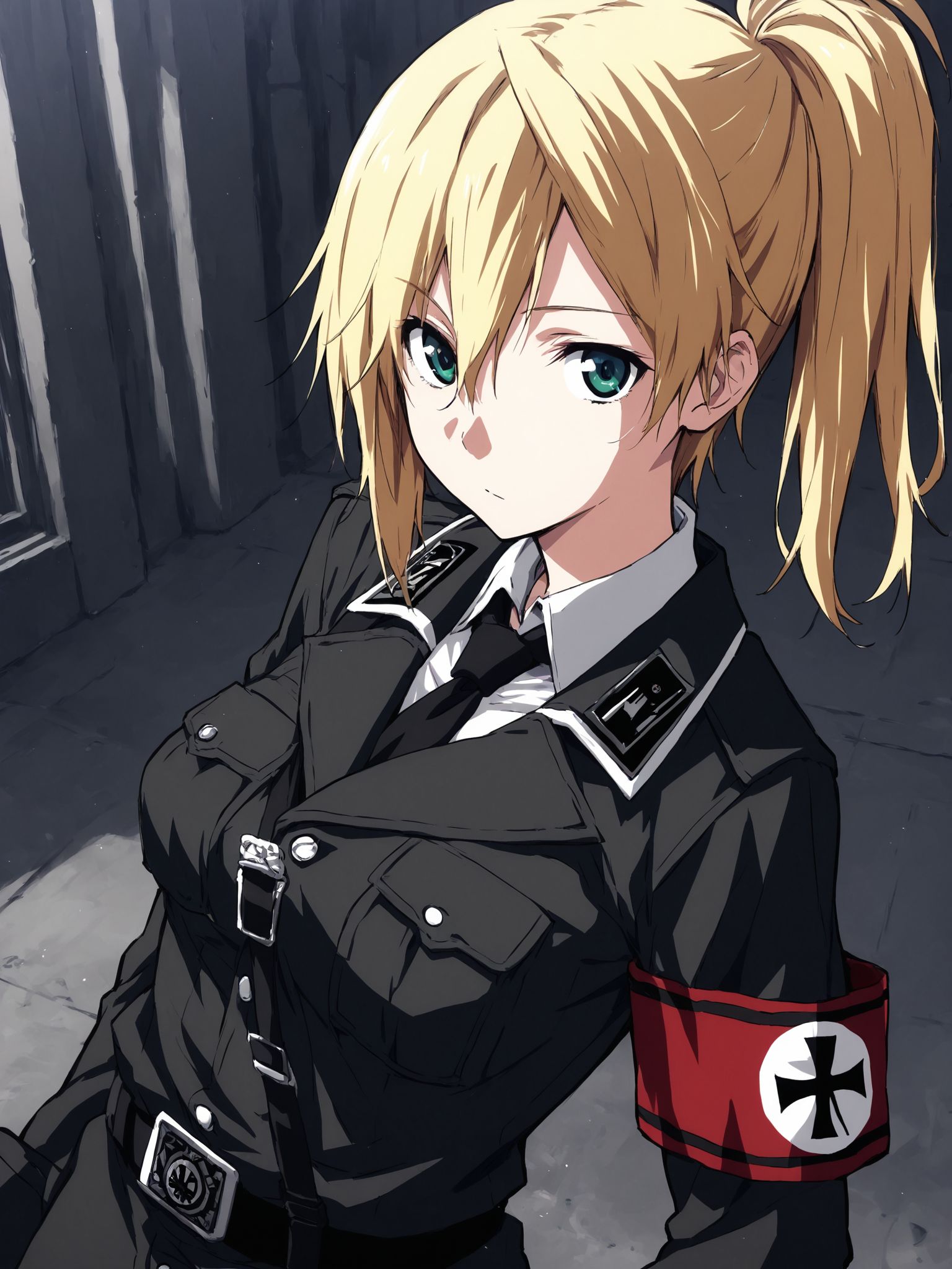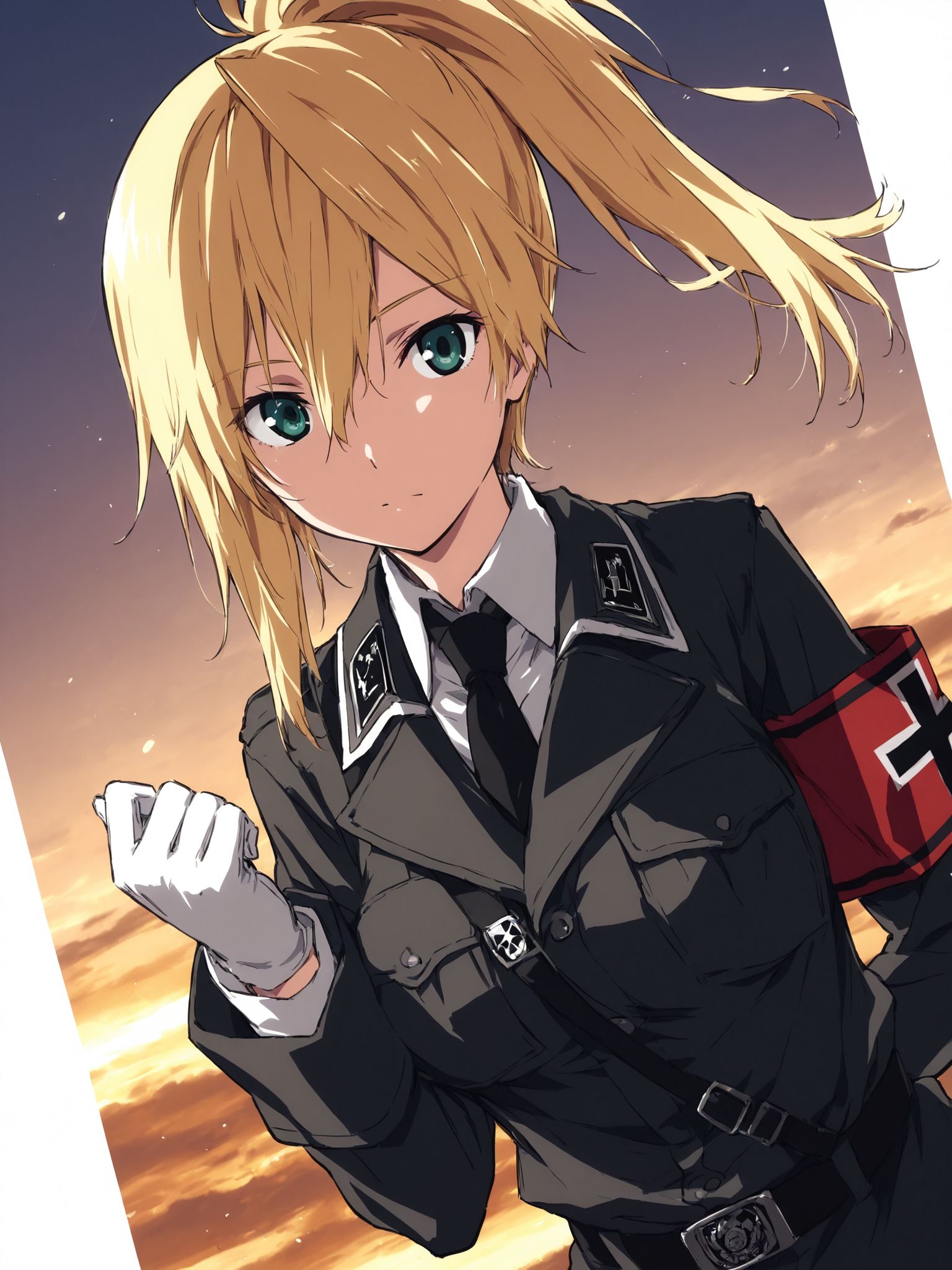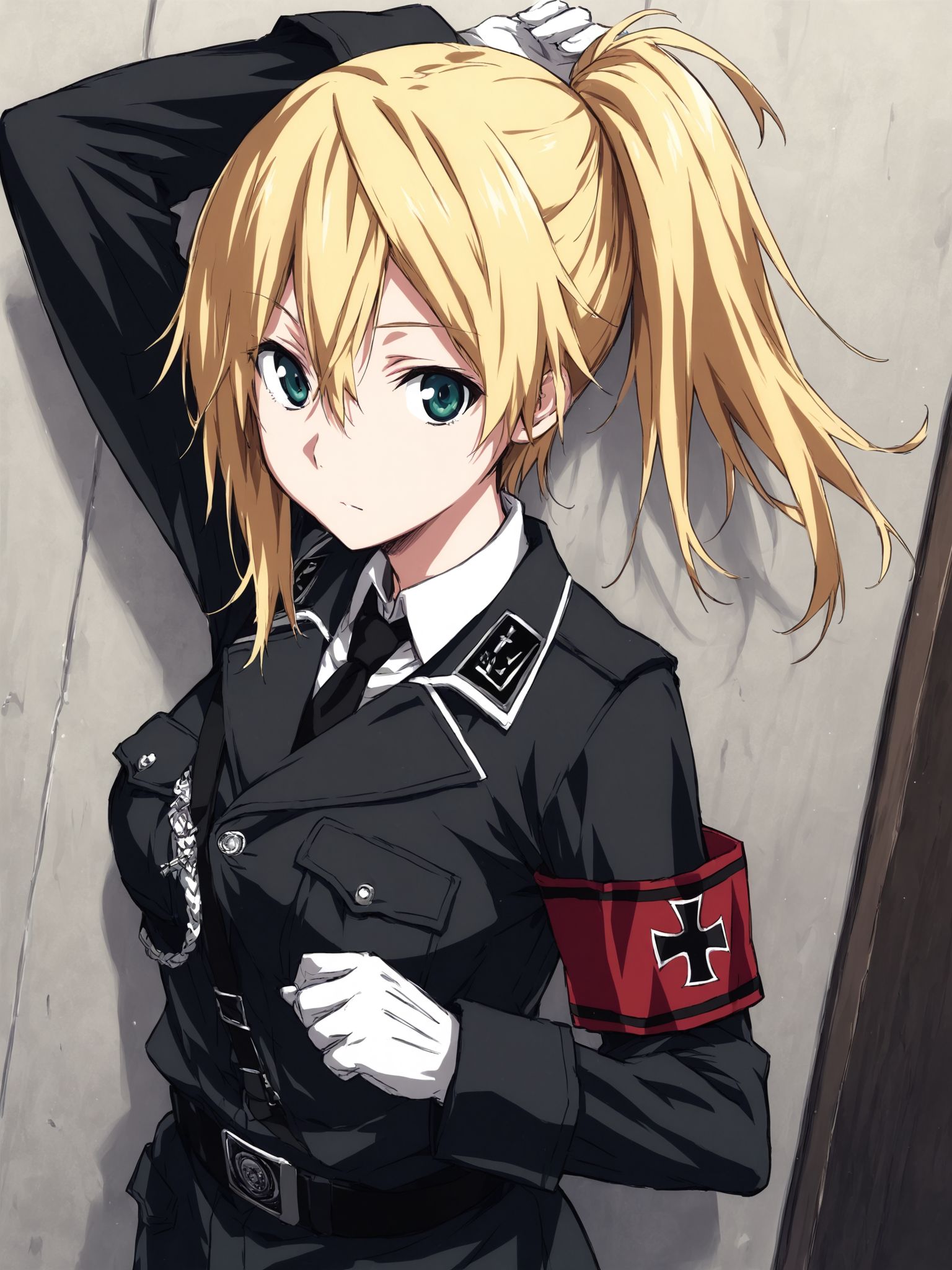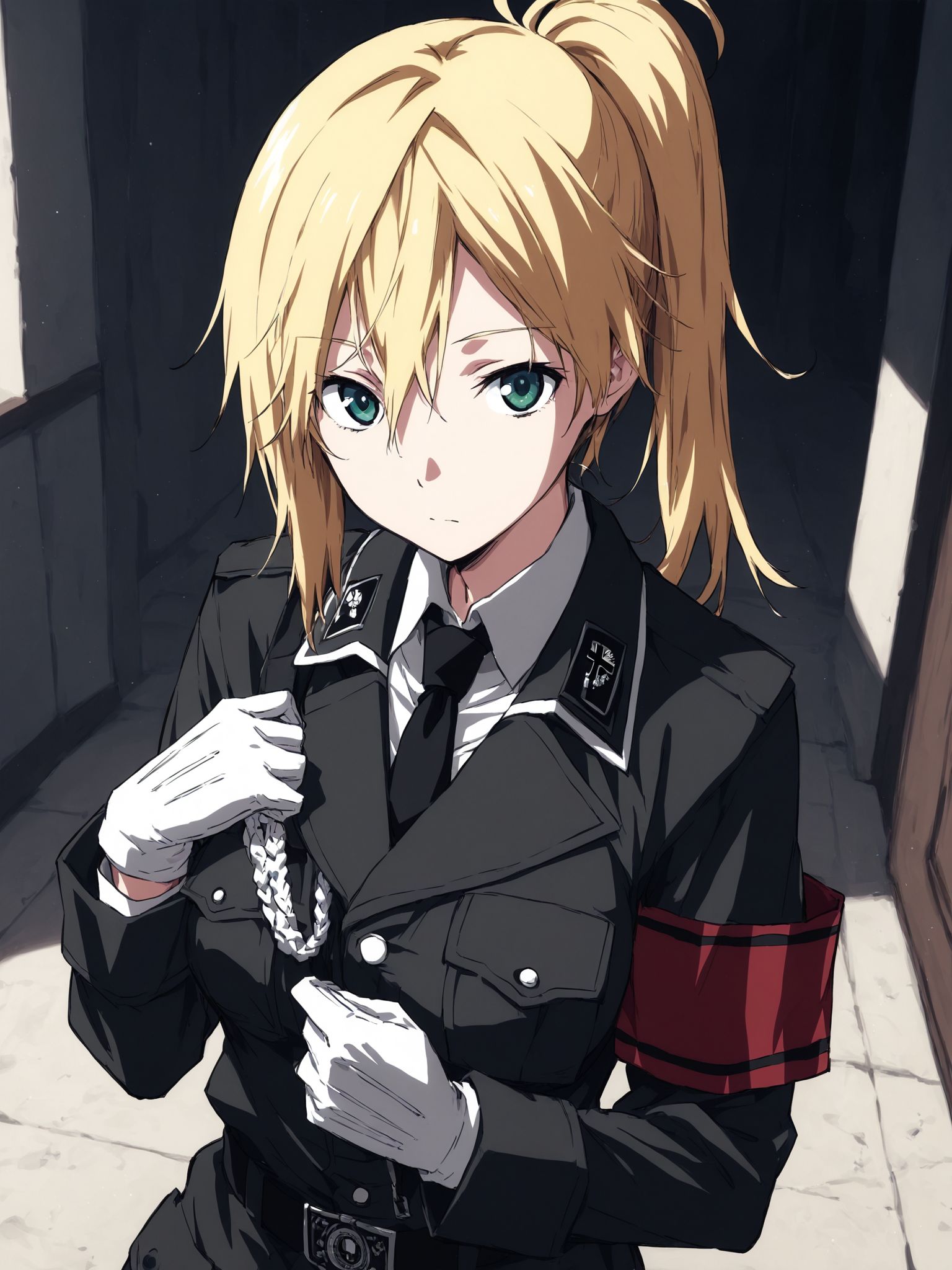 military uniform,black jacket,coat,long sleeves,wing collar,collared shirt,white shirt,black necktie,breast pocket,armband,iron cross,white gloves,black belt,
