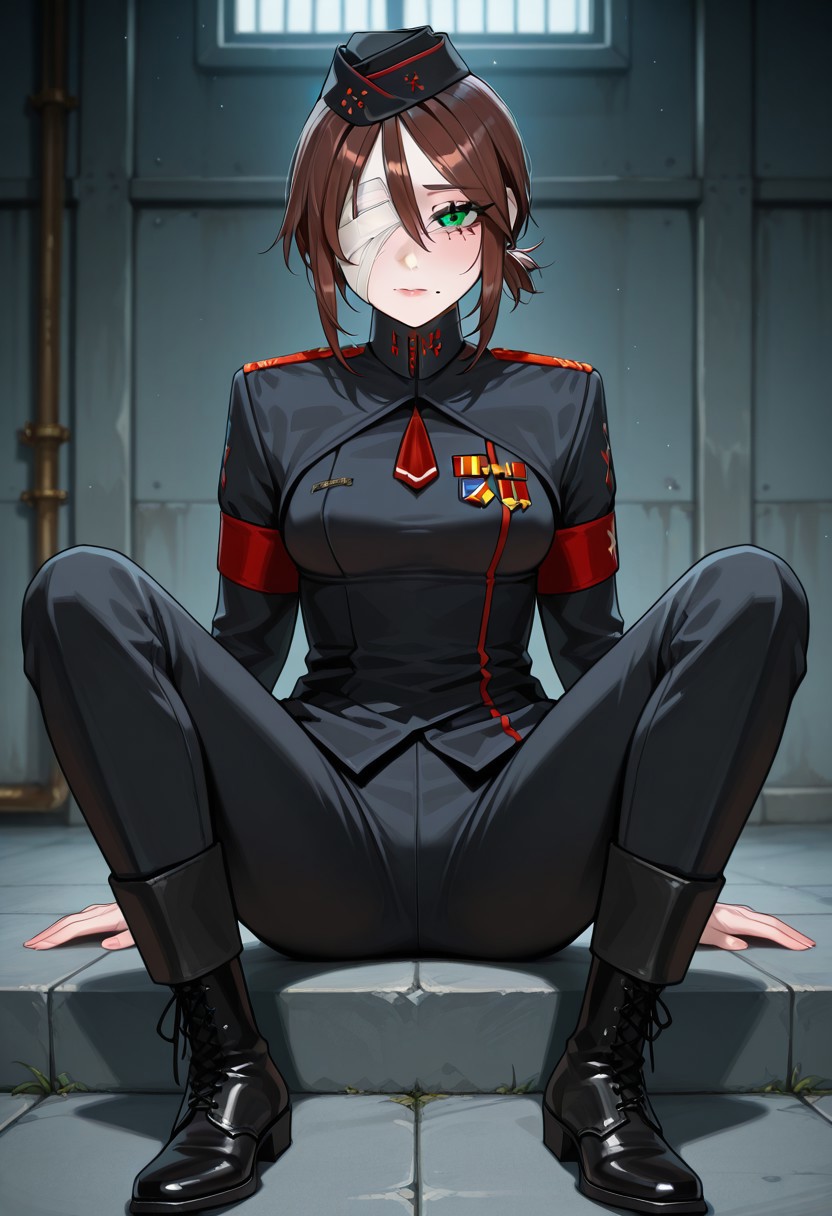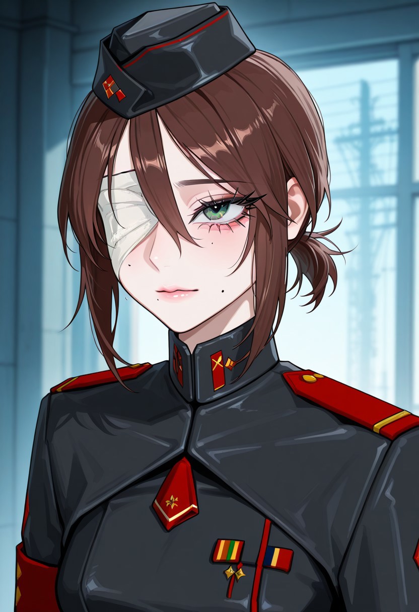 hat, black headwear, bandage over one eye, garrison cap, military uniform,