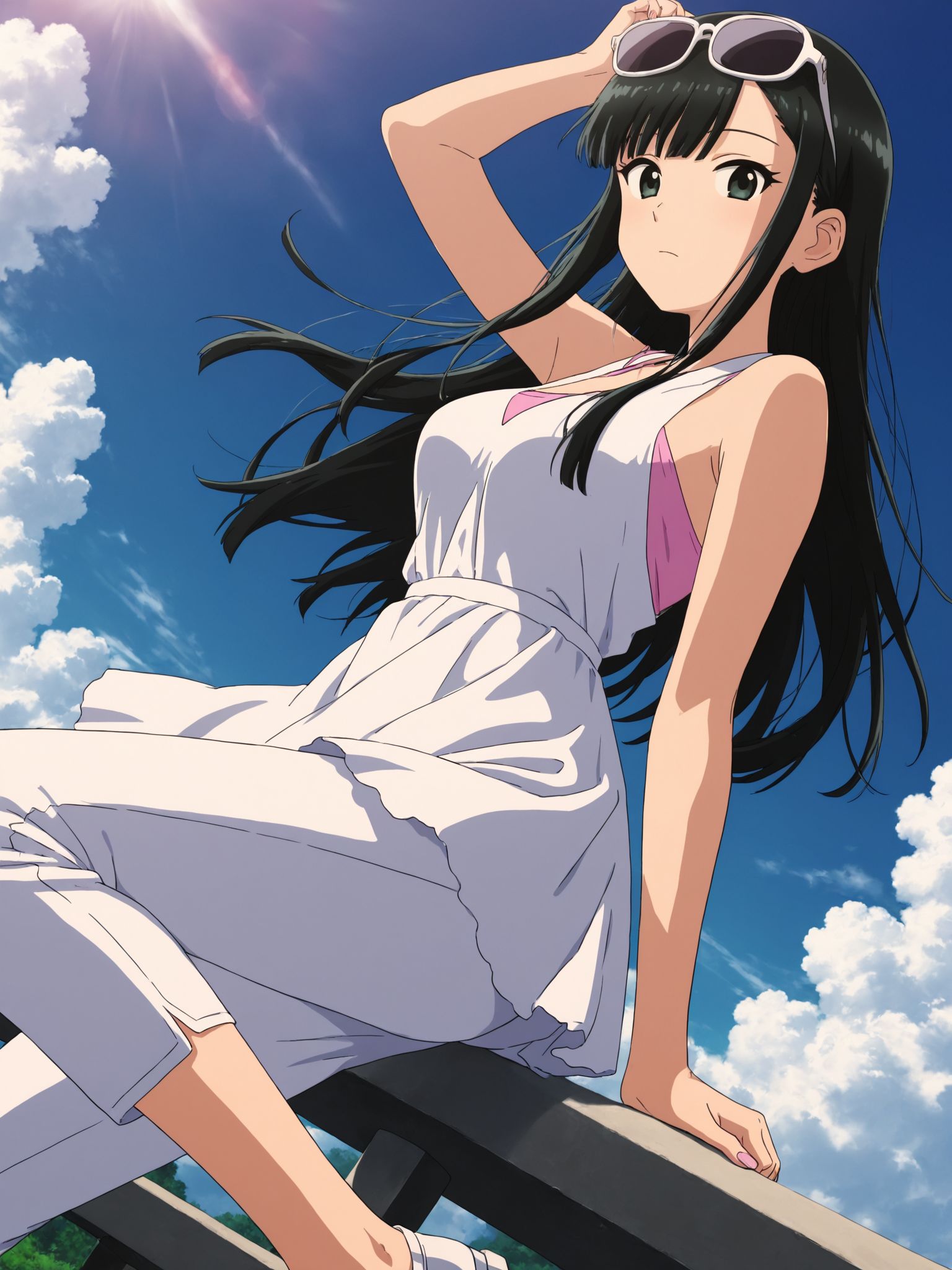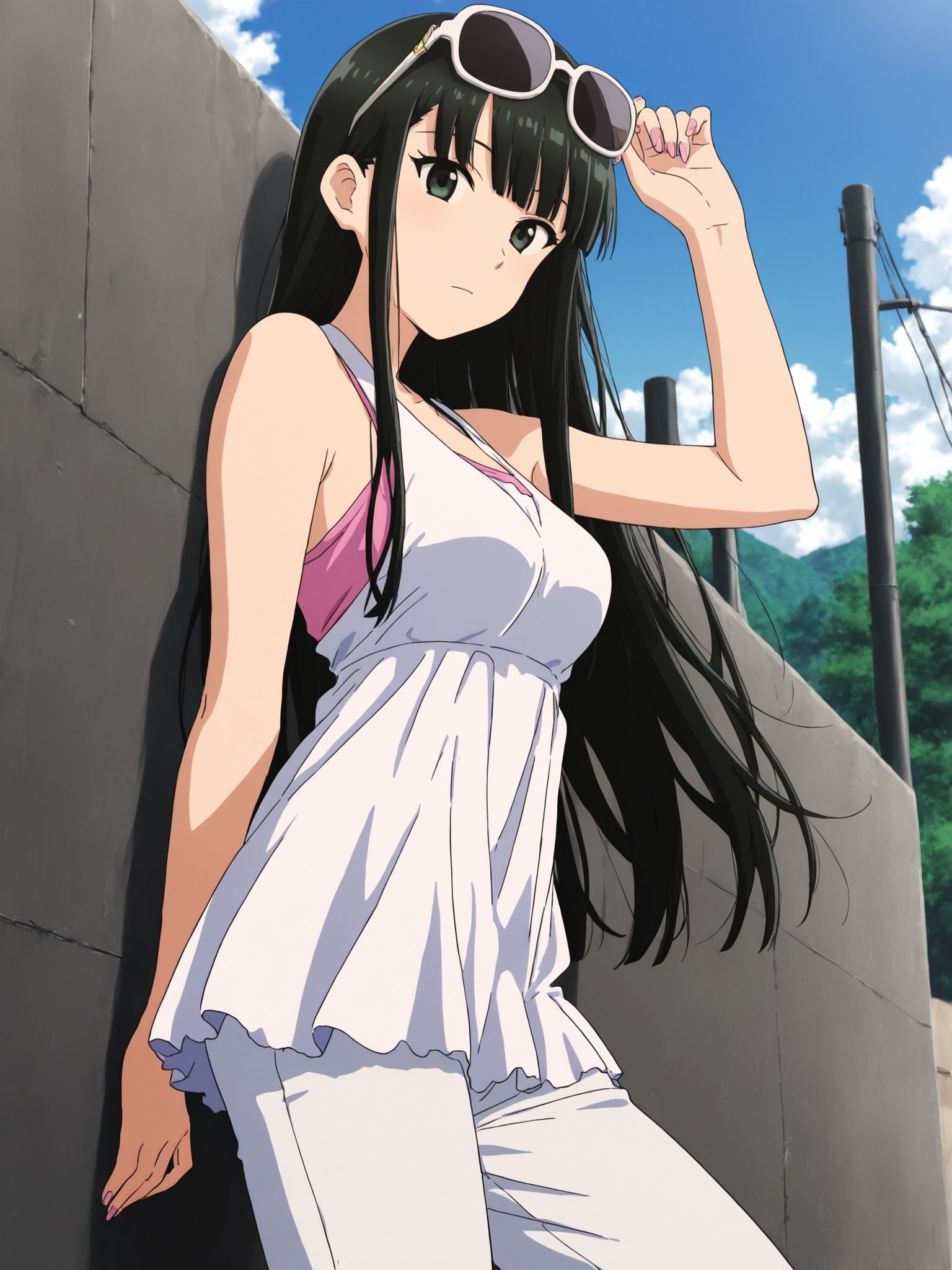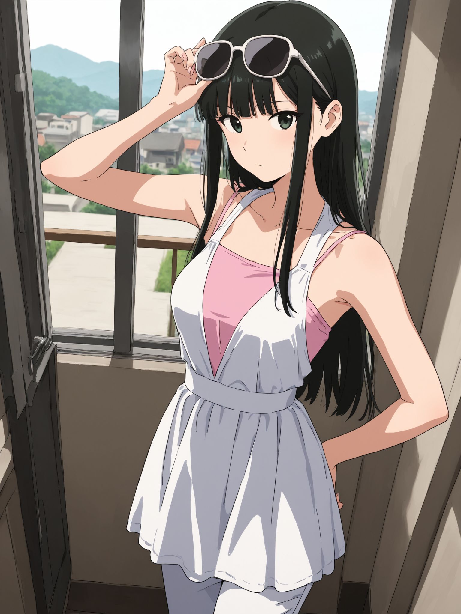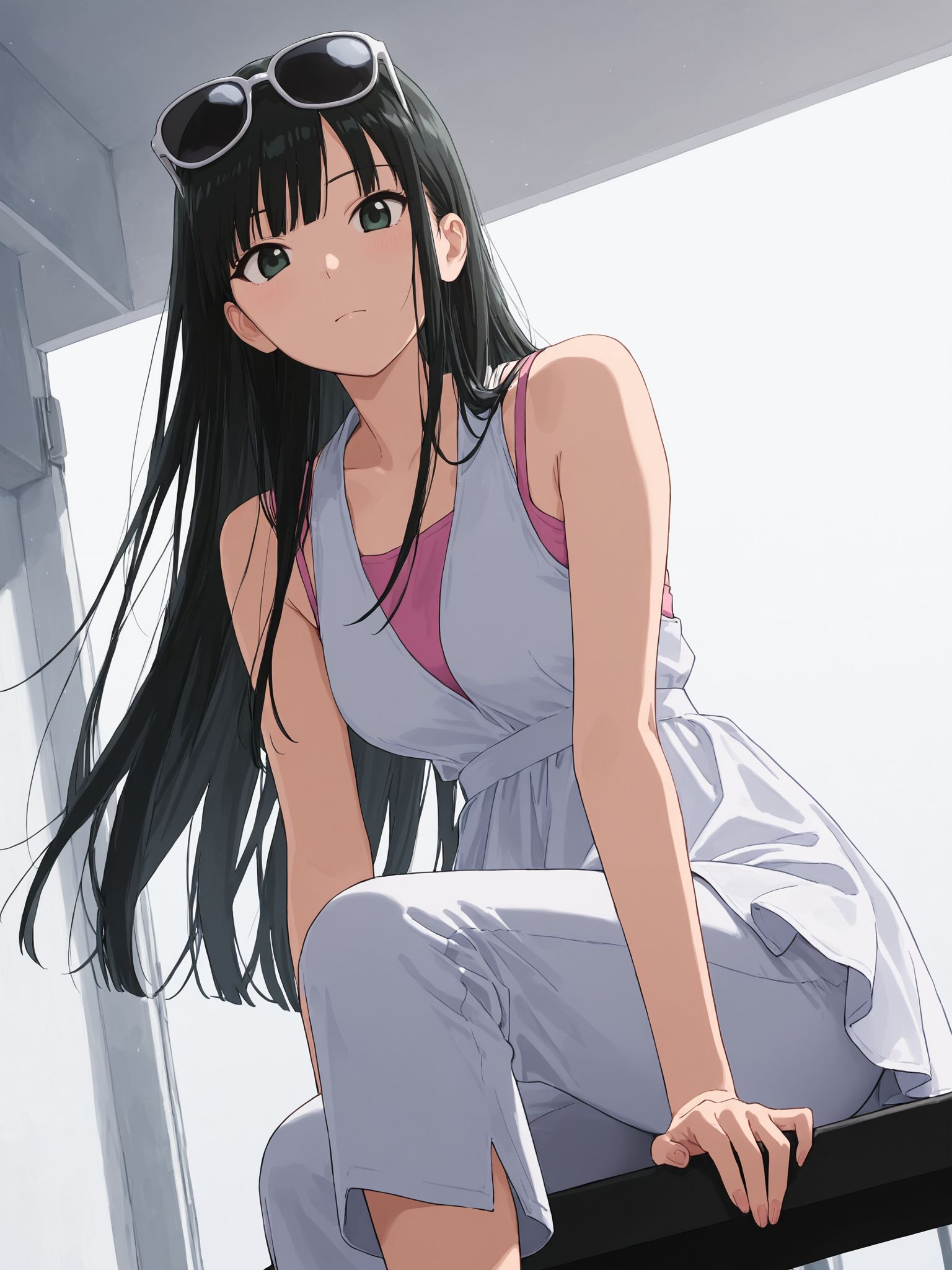 sunglasses,eyewear on head,bare shoulders,sleeveless dress,white dress,pink shirt, white capri pants,