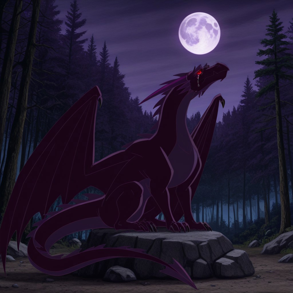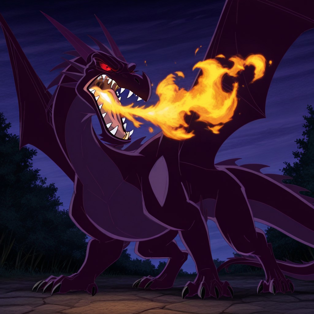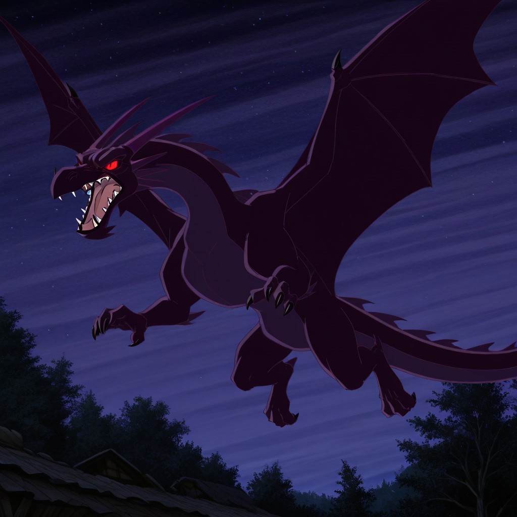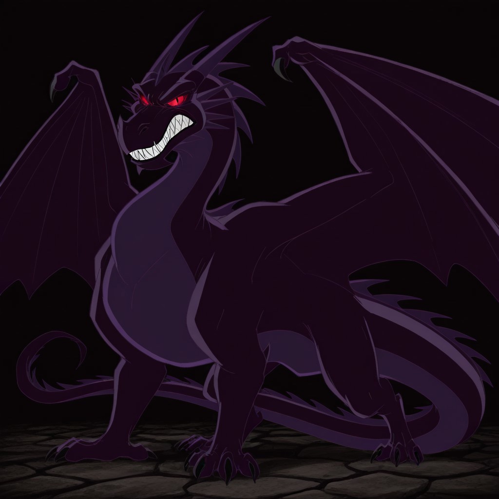 Glasburgh Dragon, dragon, dark purple body, purple belly, purple horns, purple spines, black claws, glowing red eyes