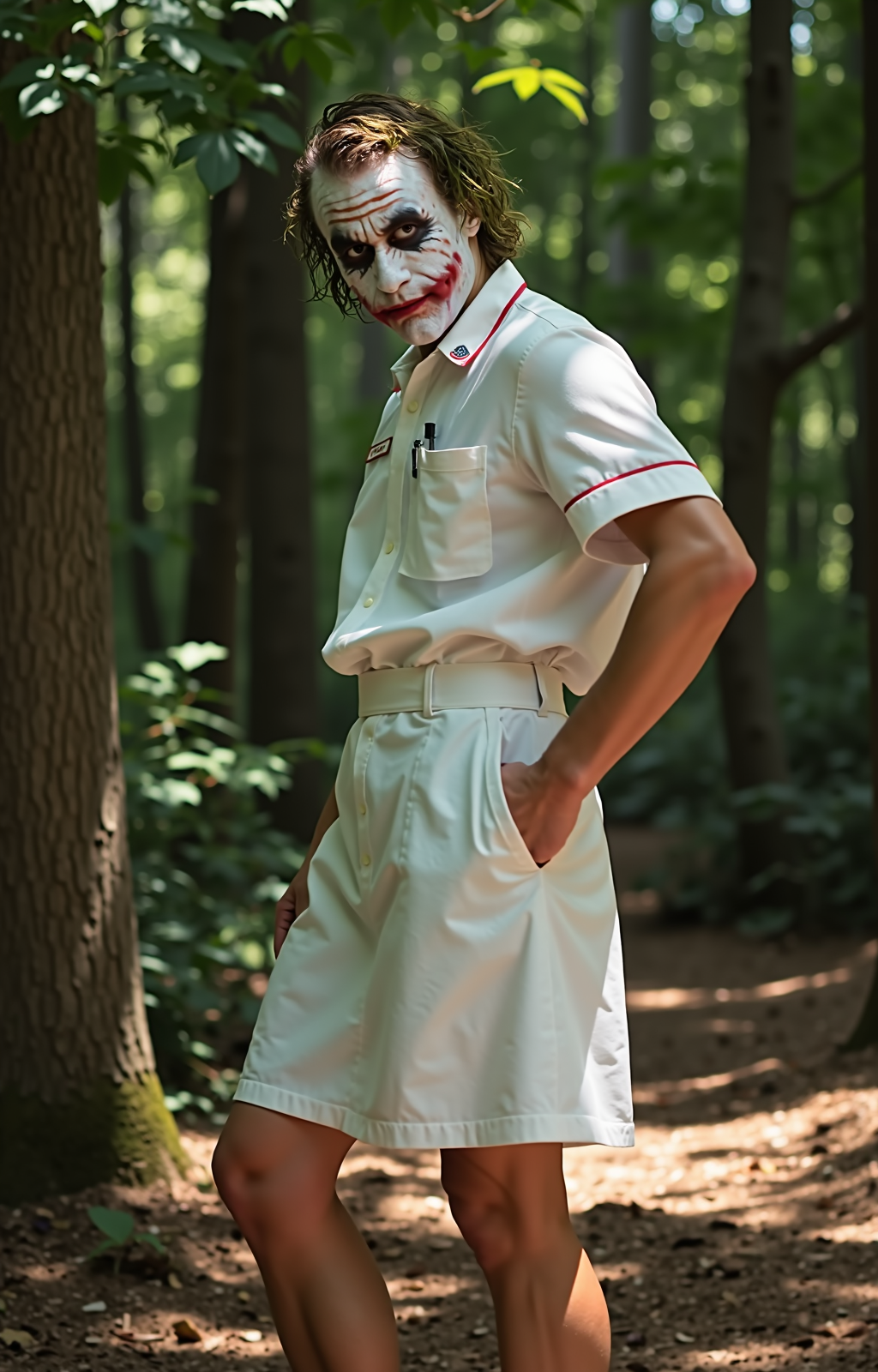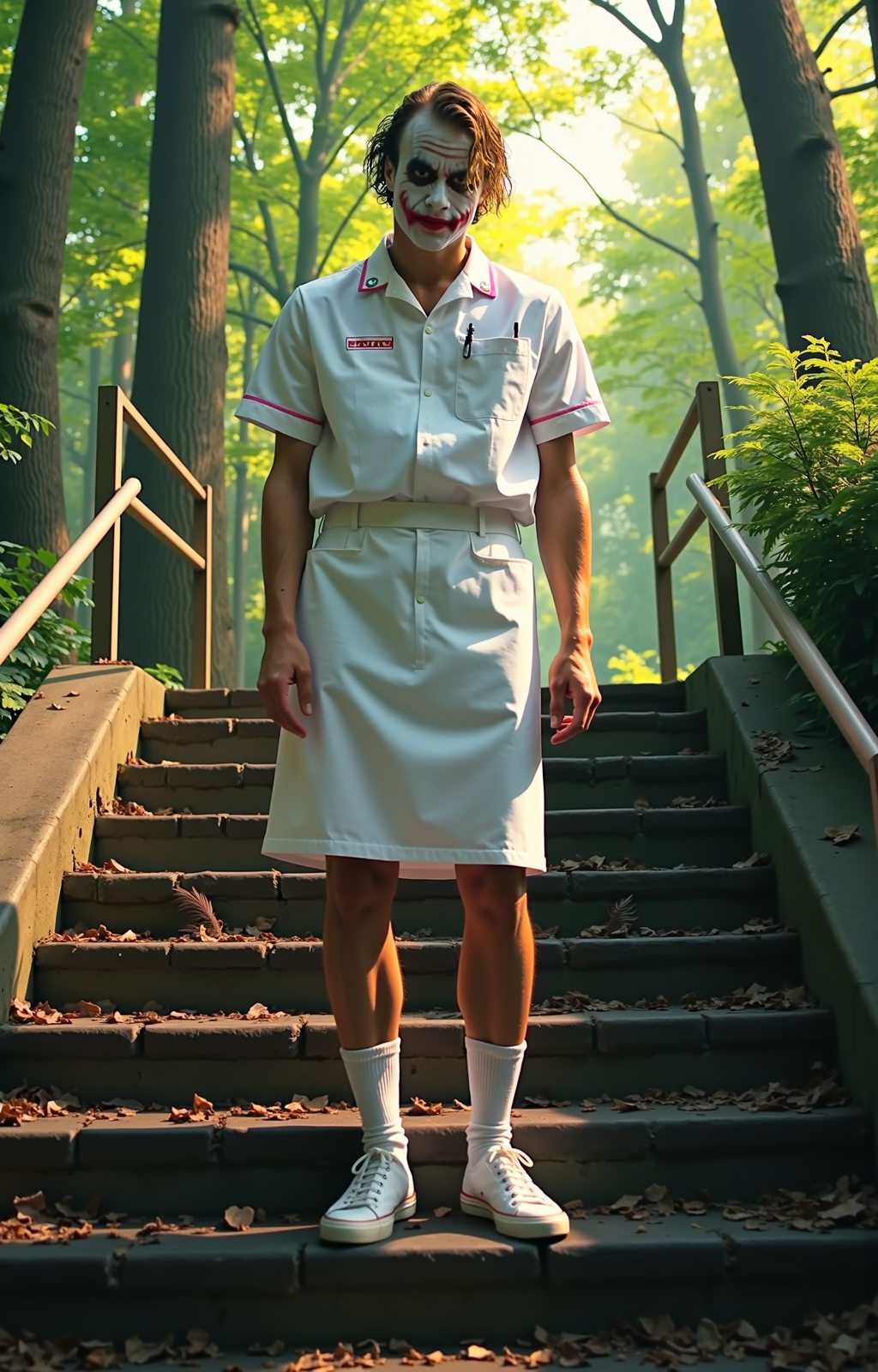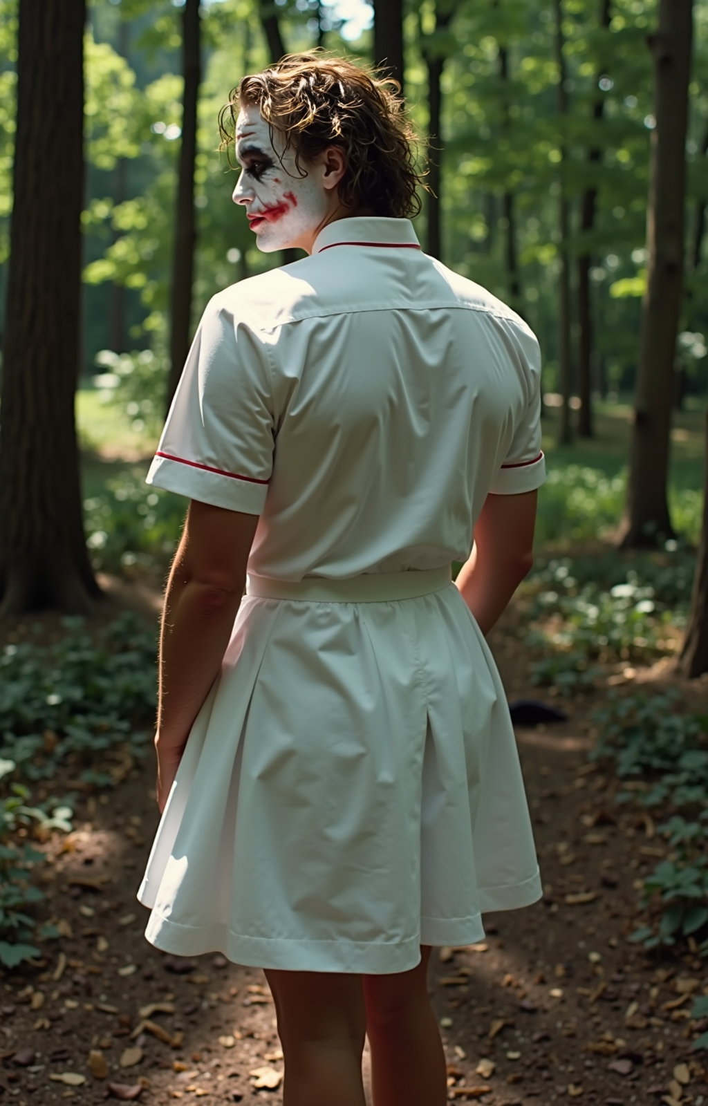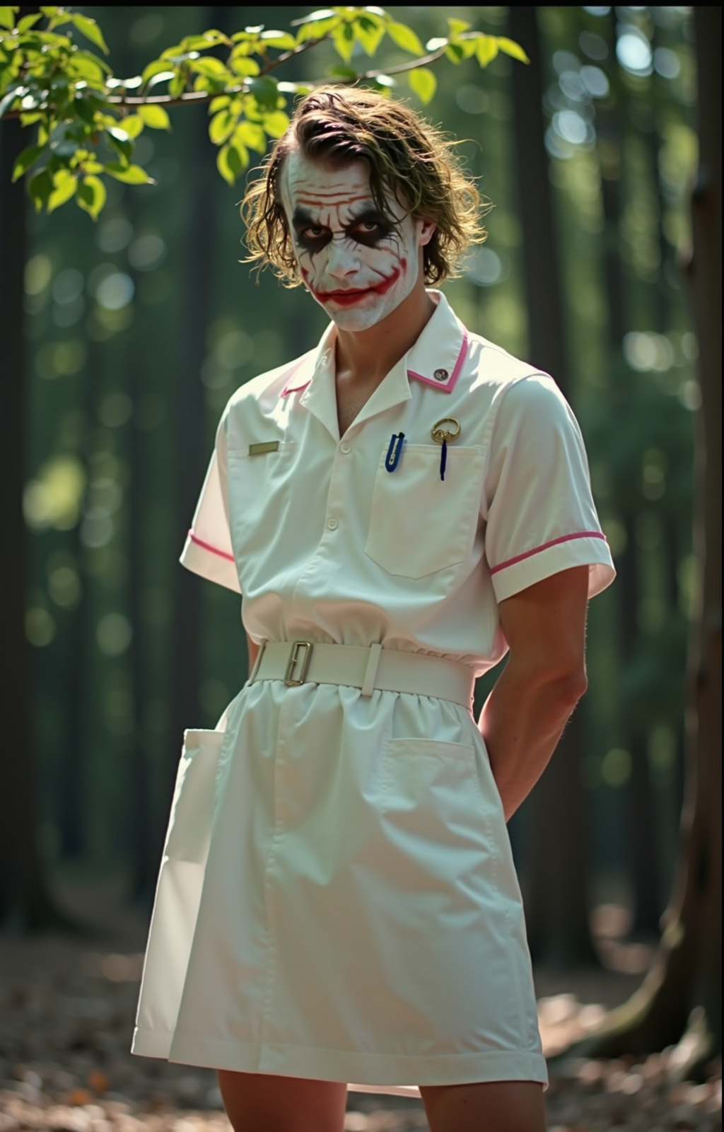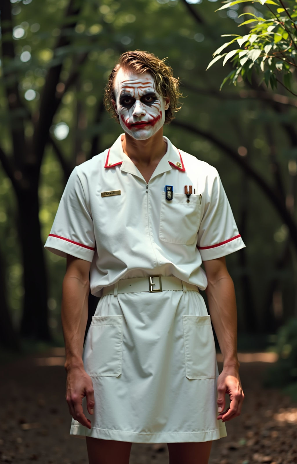 man, realistic, photo realistic, photography, short hair, fluxjoker, solo, male focus, outdoors, mutilcolor hair,leaf, burry background, sunlight, back lighting, forest, white nurse outfit, bare legs, upper body, cowboy shot, skirt, looking viewer, close up, portrait