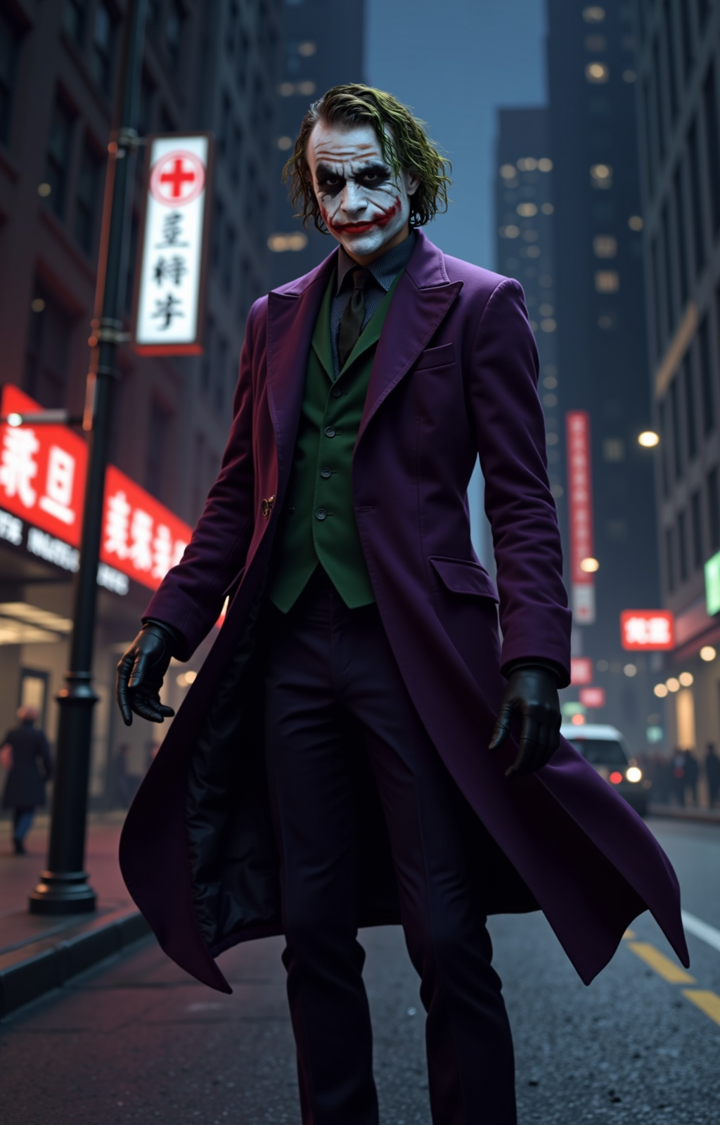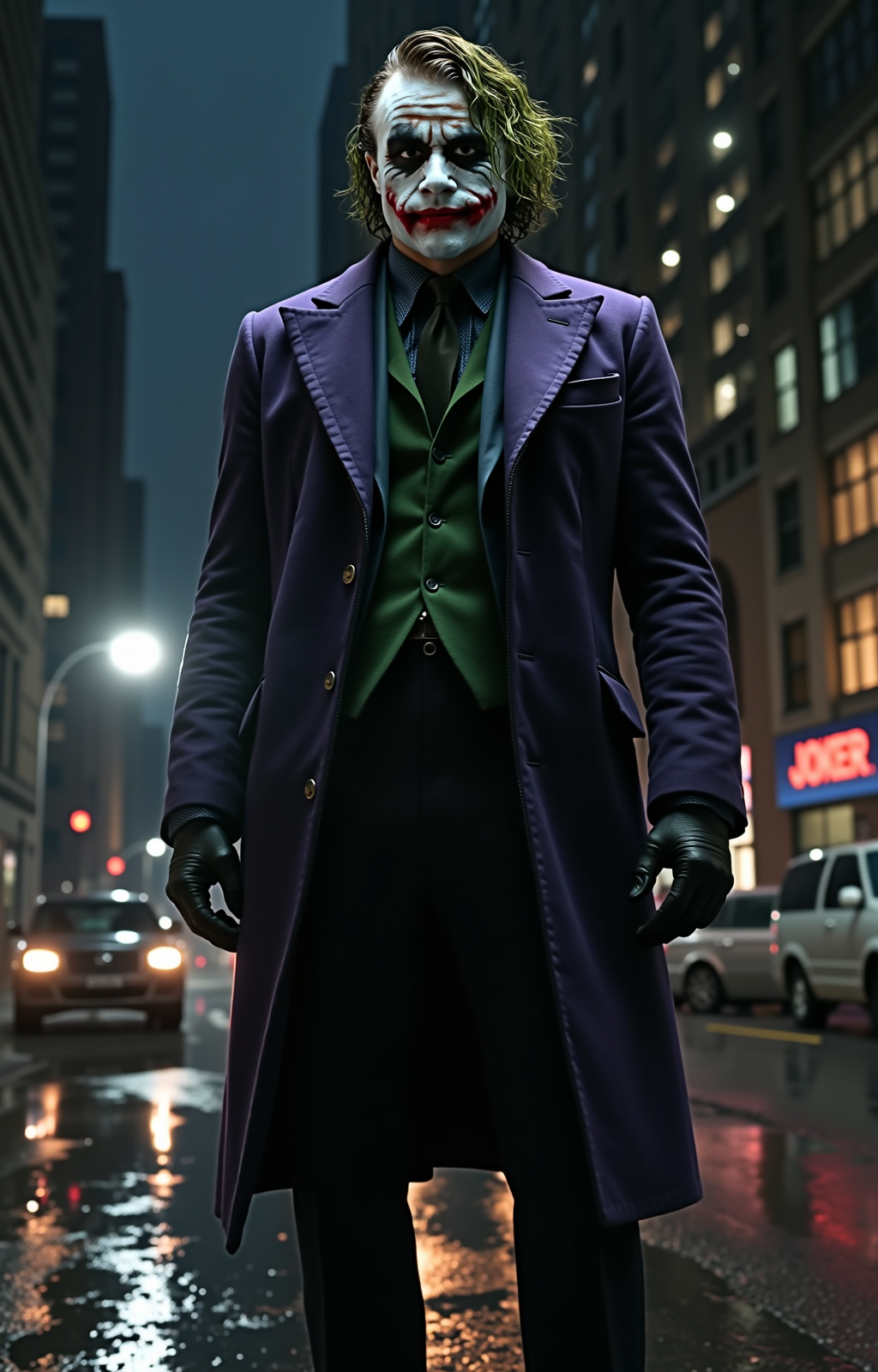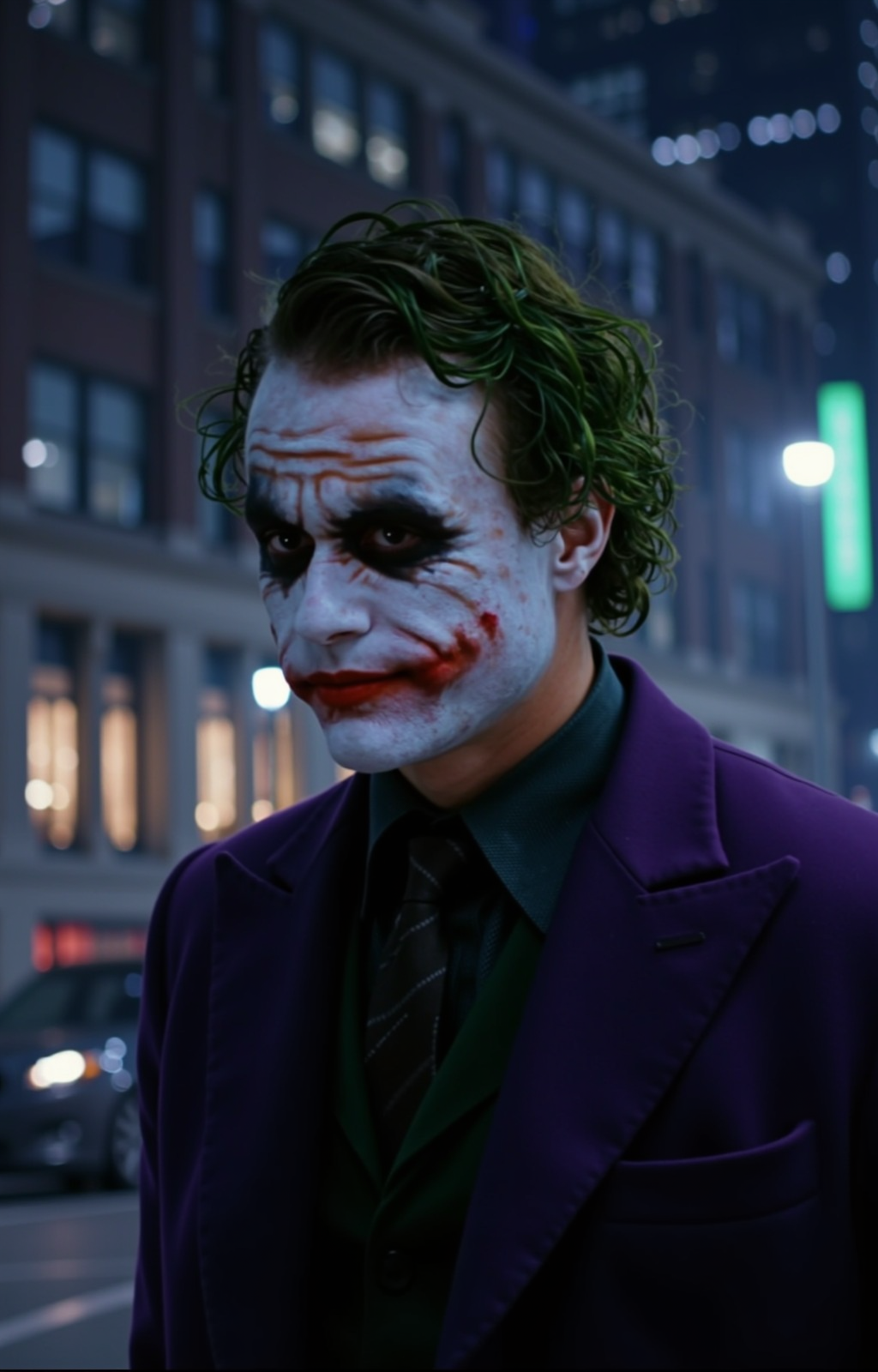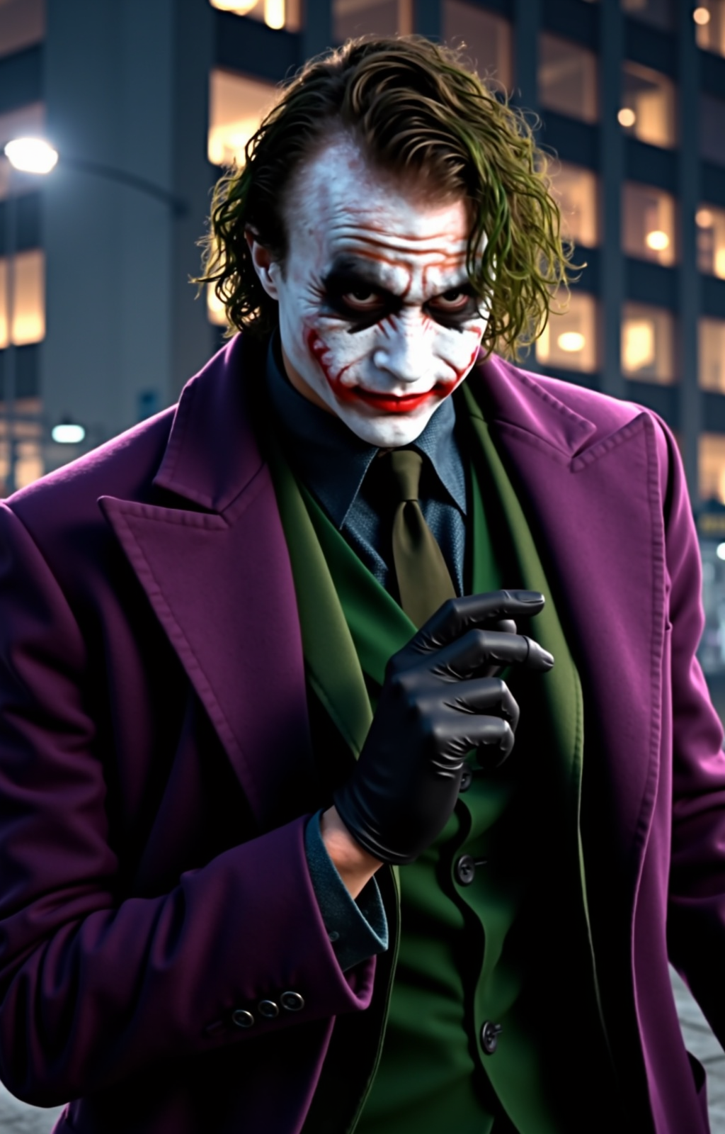 realistic, short hair, fluxjoker, male focus, solo, green hair, looking at viewer, realistic, closed mouth, smile, city, night, building, suit