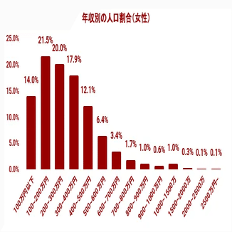 ちなみに、国税庁のデータを元にタレントスクエアが作成したグラフを見ると、女性のおよそ半数以上(55.5%)が年収300万円以下である事が分かります。日本の人口が1億2000万人くらいですので、男女比が半々であると仮定して、単純計算でおよそ3000万人以上の弱者女性が存在している事に!自分が弱者でありながら、自認がなぜか上級国民で、竹中平蔵さんのように弱者をバカにしていい風潮を必死に作ろうとし、実際にその余波で女性の自殺率が急激に増えているのを見ると、「自業自得」「因果応報」という感じがしますね♪