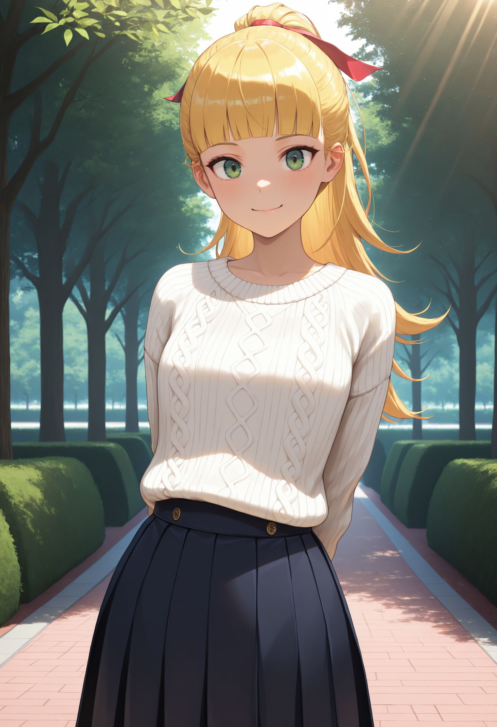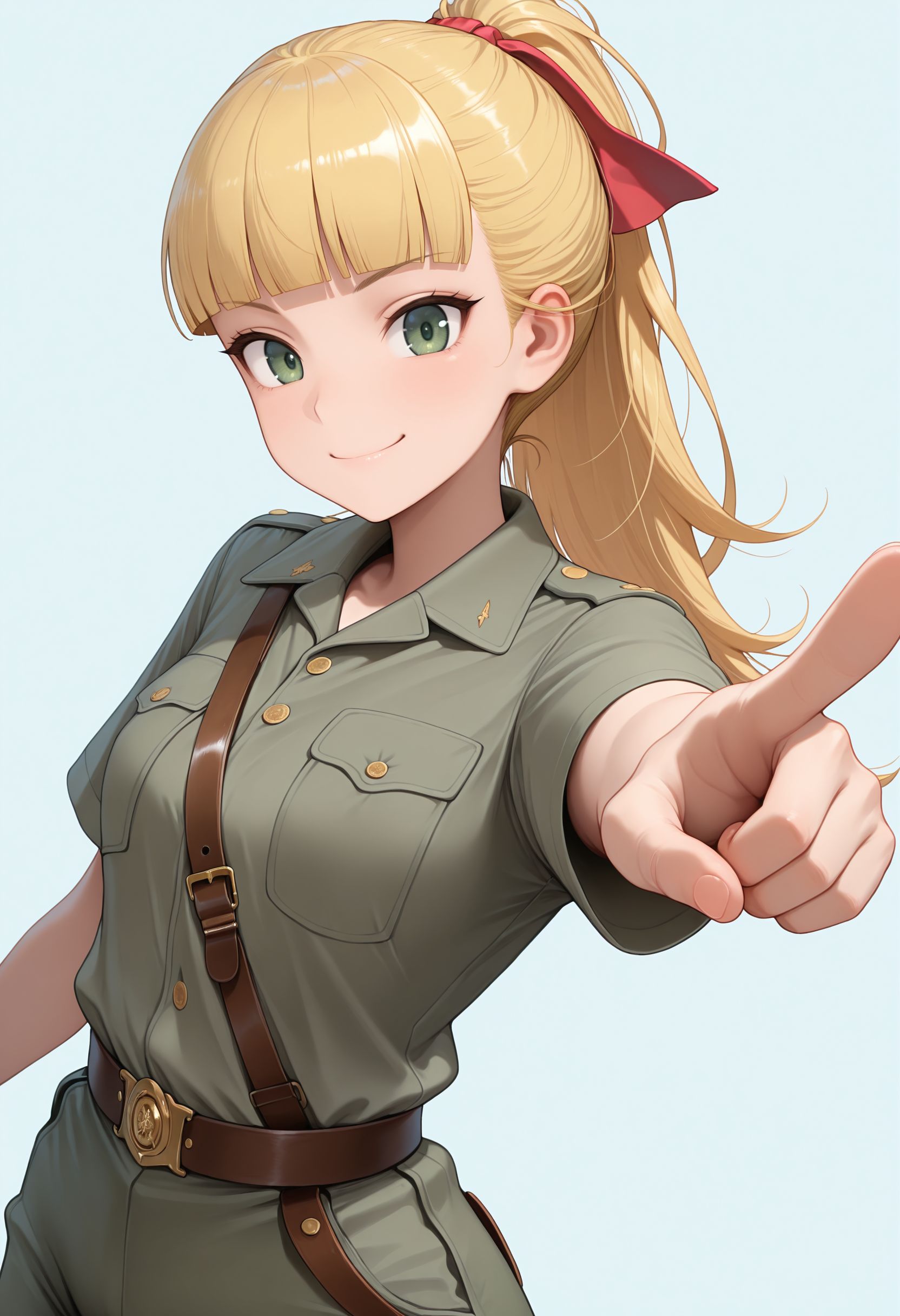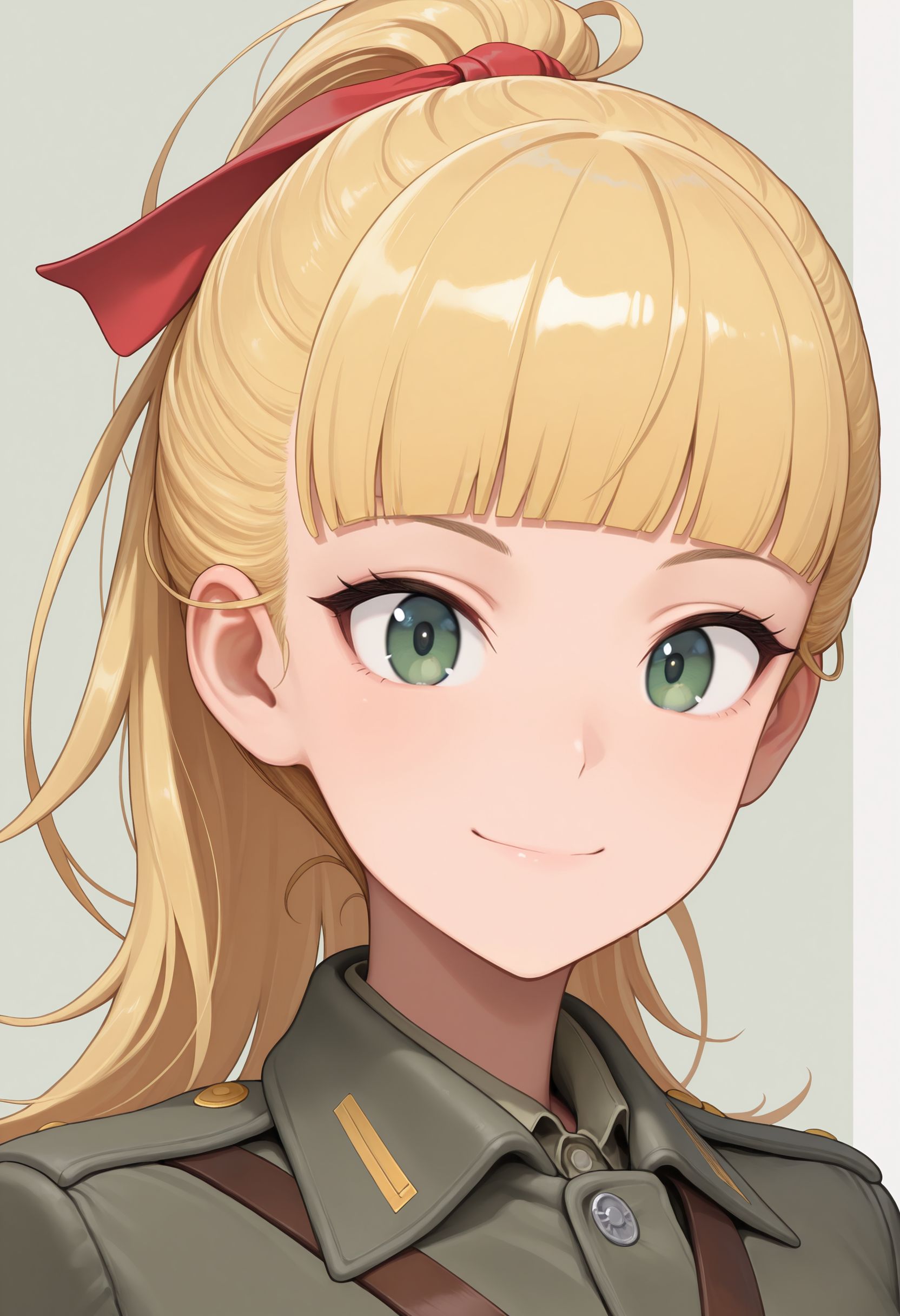 1girl, blonde hair, long hair, ponytail, blunt bangs, hair ribbon, red ribbon, green eyes, shirt, short sleeves, military uniform, sam browne belt, green shorts, green thighhighs, black footwear, boots