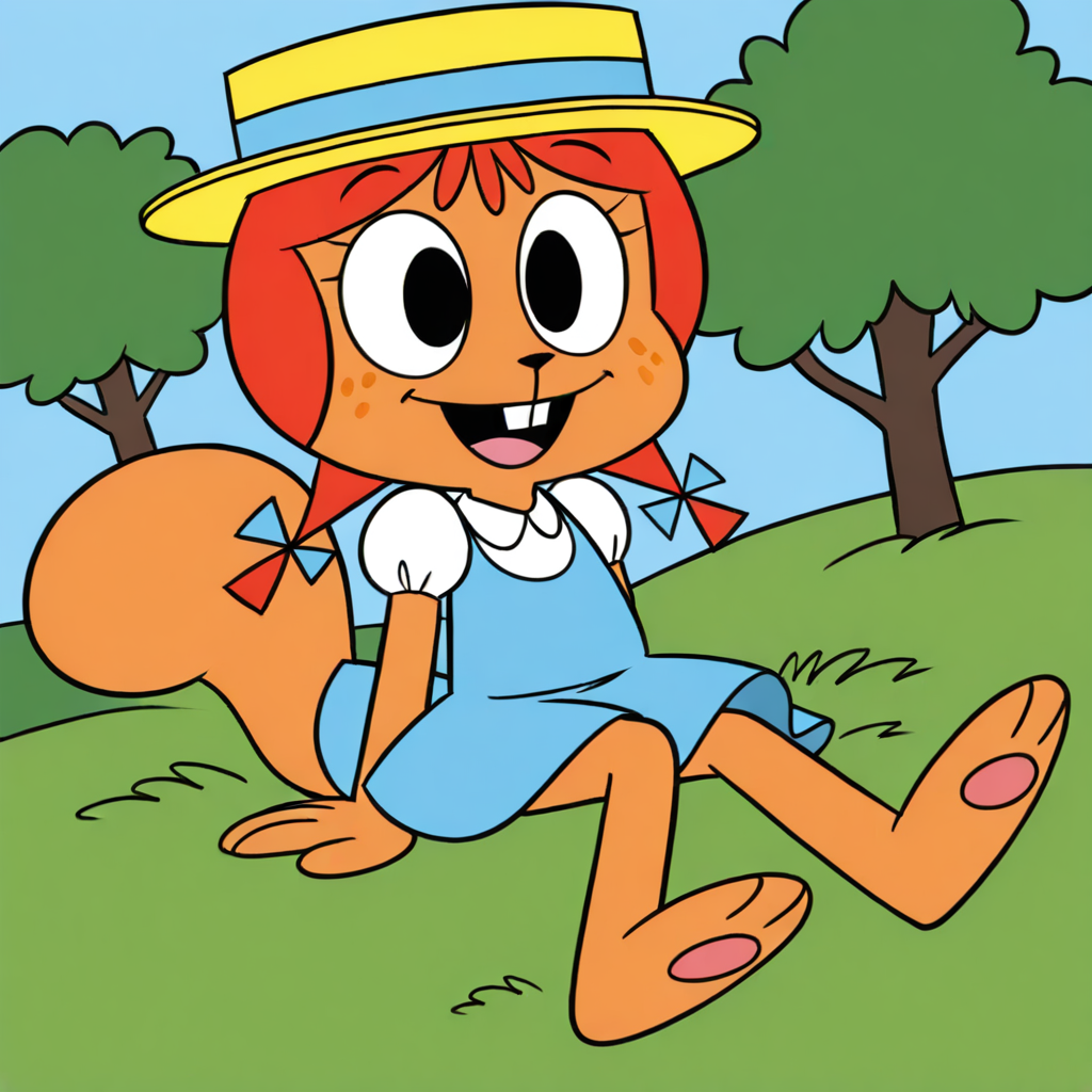 cinnam0n_j, red hair, 1girl, tan fur, squirrel girl, twintails, bows in hair, twin braids, black eyes, freckles, buck teeth, animal nose, furry, squirrel tail, animal ears, blue dress, hat,