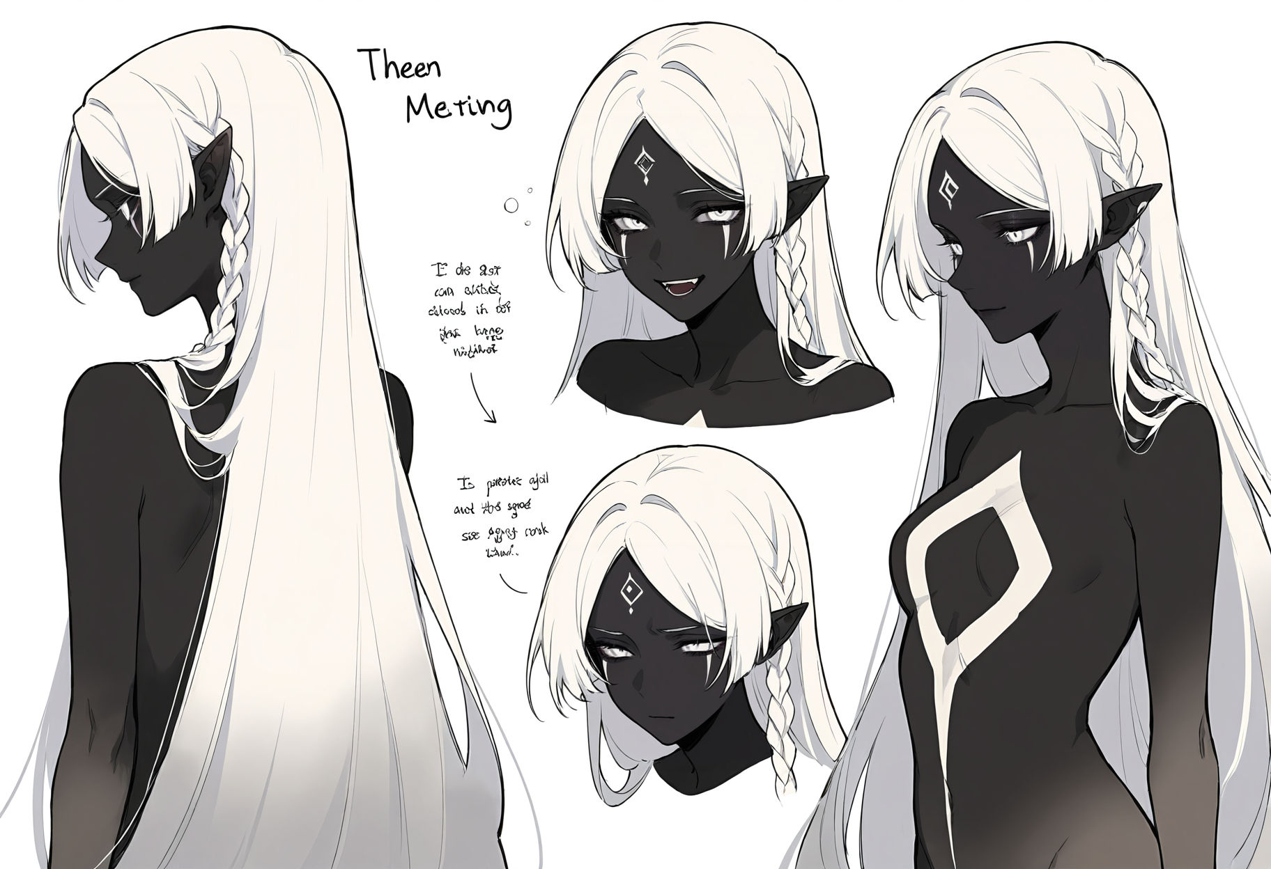 THS_3,1girl,white eyes,facial mark,dark skin,no mouth,black skin,colored skin,grey skin,white skin,dark-skinned female,long hair,very long hair,absurdly long hair,white hair,multicolored hair,bangs,parted bangs,braid,hair flowing over,hair spread out,pointy ears