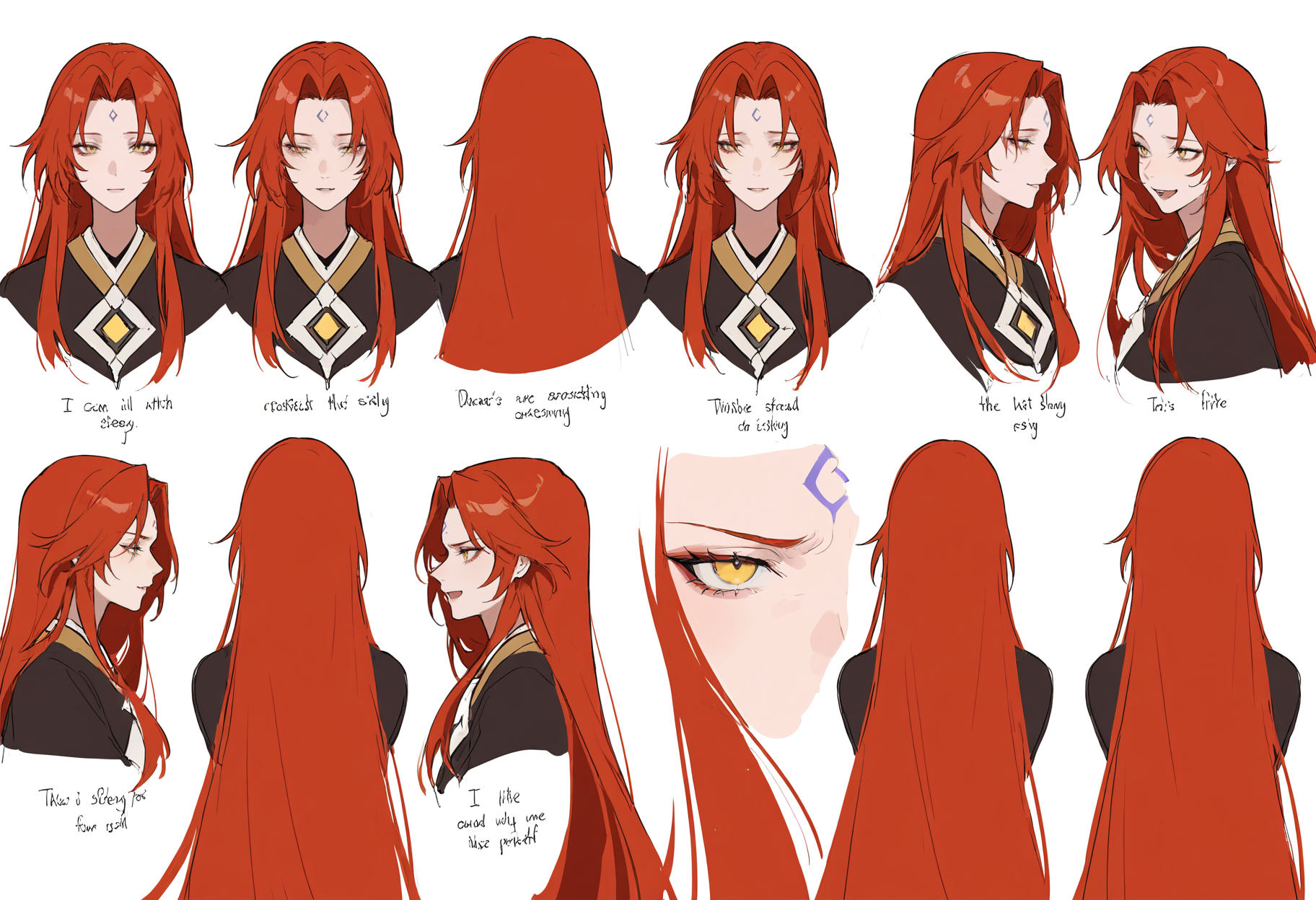 THS_4,1girl,yellow eyes,facial mark,forehead mark,red hair,long hair,very long hair,absurdly long hair