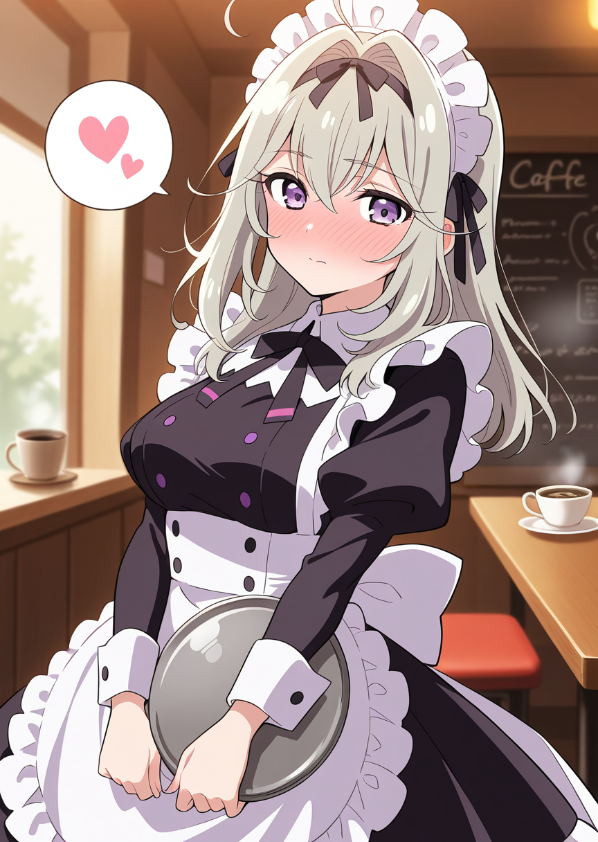 Luluka: moria luluka, silver hair, black dress, white undershirt, purple legwear, purple eyes, necklace, hair ribbon, black footwear,