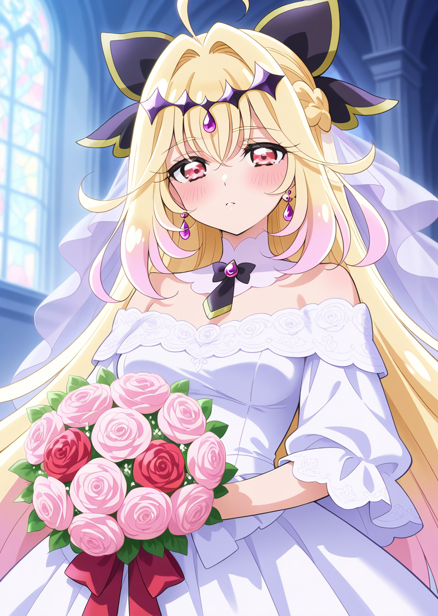 Cure Arcana Shadow: cure arcana shadow, holding staff, blonde hair, hair accessories, red eyes, black magical girl outfit, black legwear, high heels, wrist cuffs, earrings
