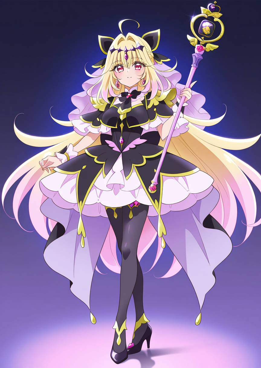 cure arcana shadow, holding staff, blonde hair, hair accessories, red eyes, black magical girl outfit, black legwear, high heels, wrist cuffs, earrings