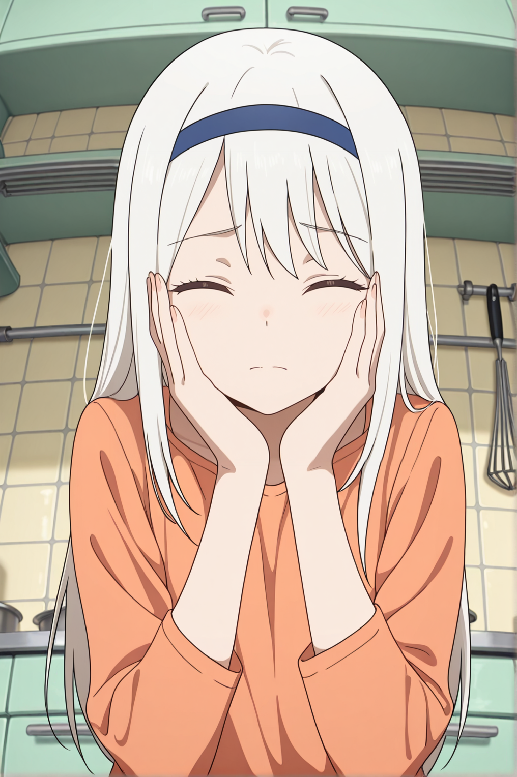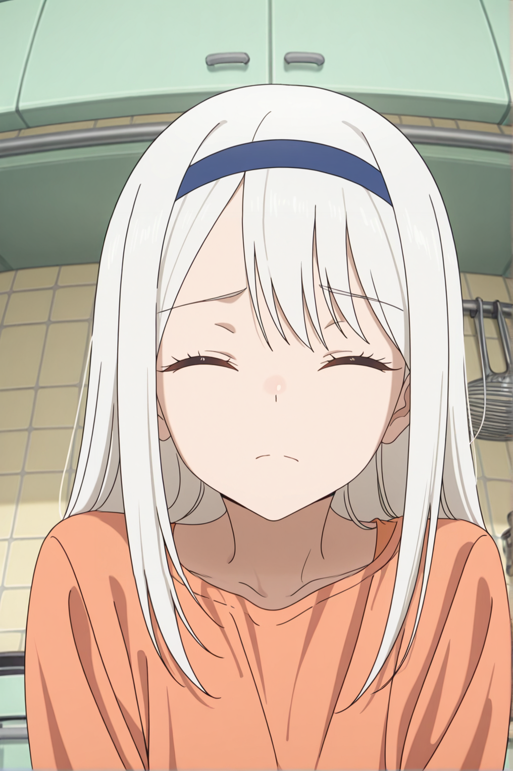 blue hairband, orange shirt, long sleeves, blue skirt