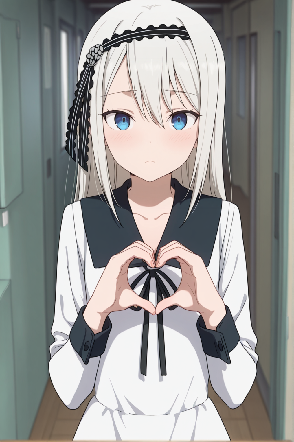 1girl, long hair, blue eyes, grey hair, bangs, school uniform, black hairband, black ribbon, white dress,