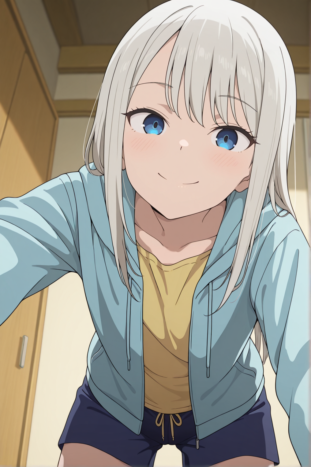blue hoodie, yellow shirt, blue shorts