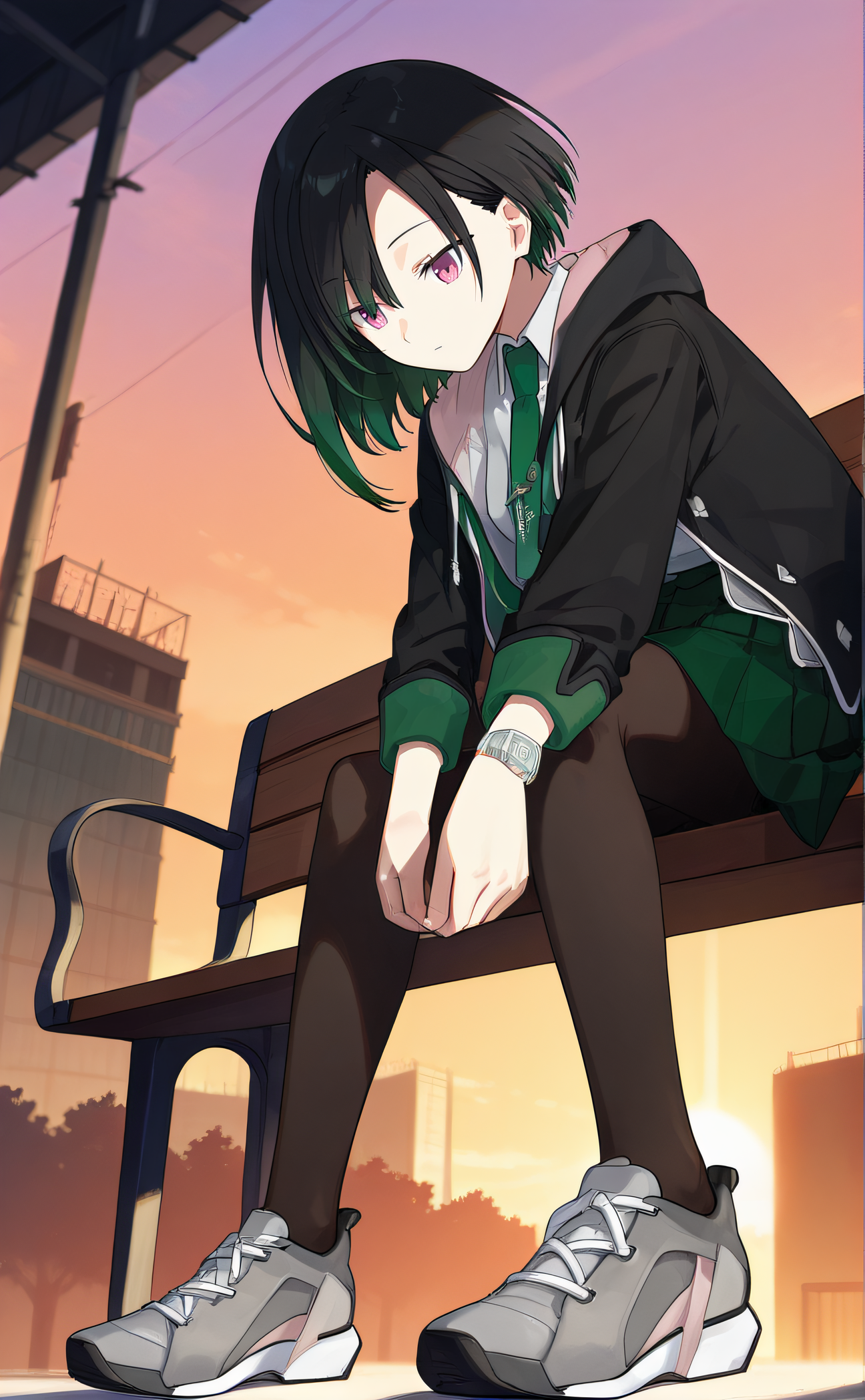 kanon, black hair, green streaked hair, pink eyes, school uniform, white collared shirt, green necktie, black jacket, open jacket, hoodie, green pleated skirt, wristwatch, black pantyhose, grey sneakers