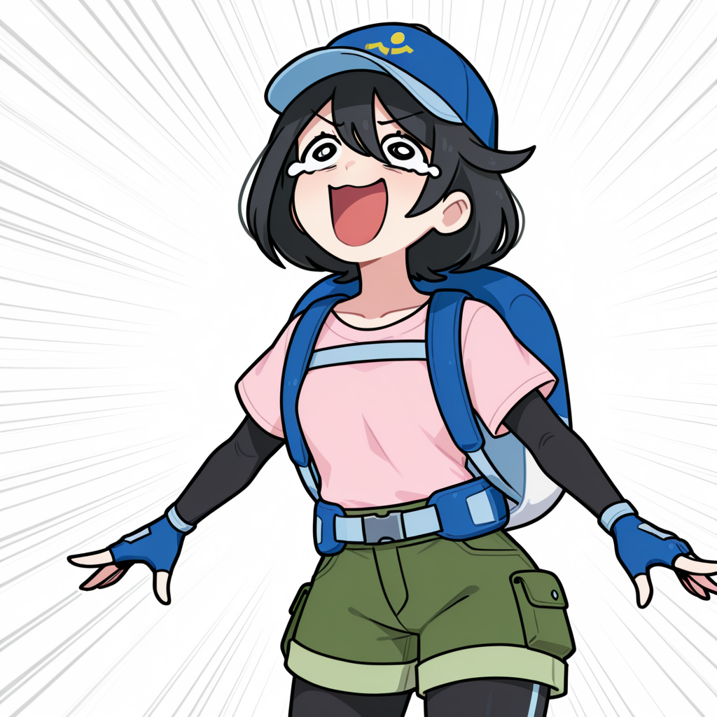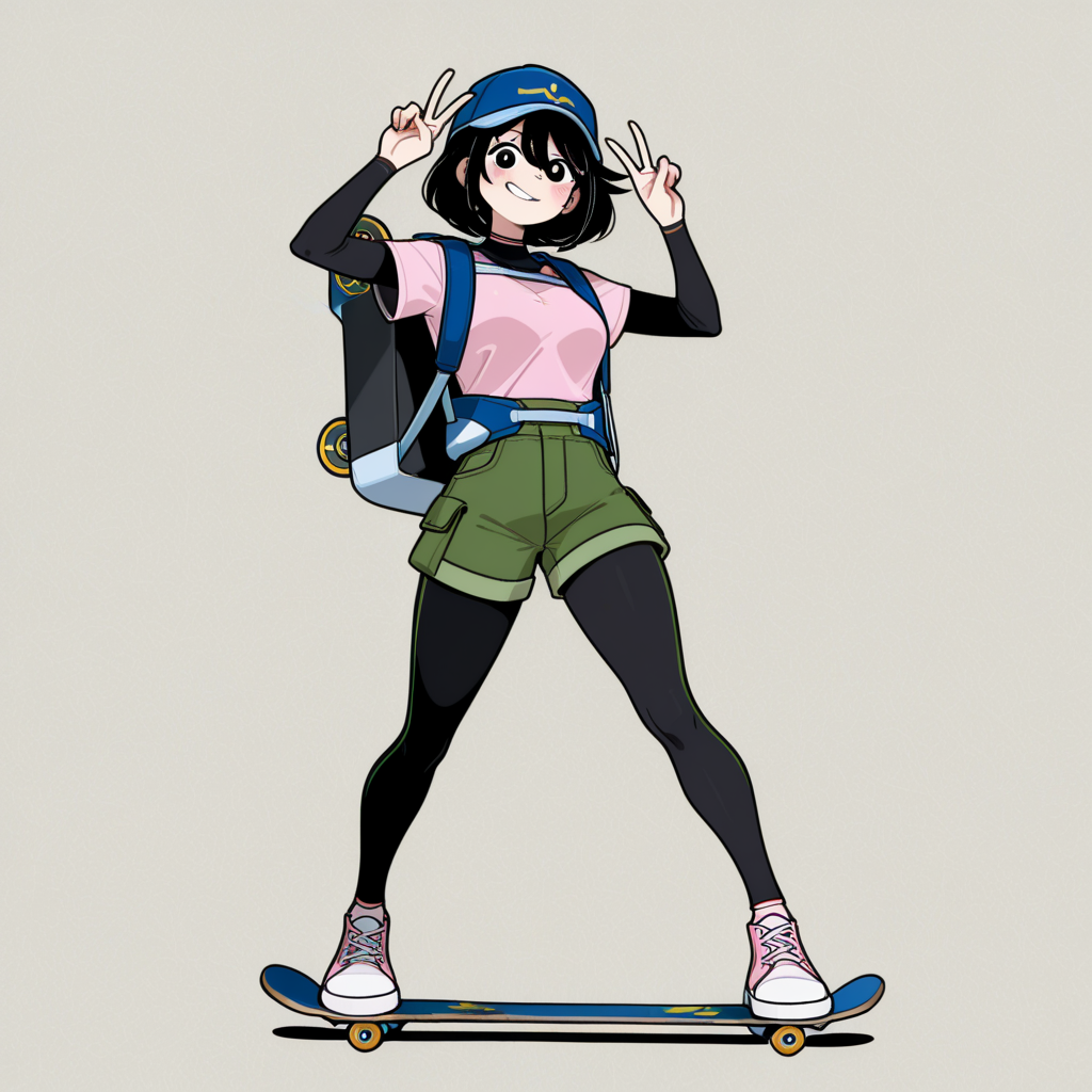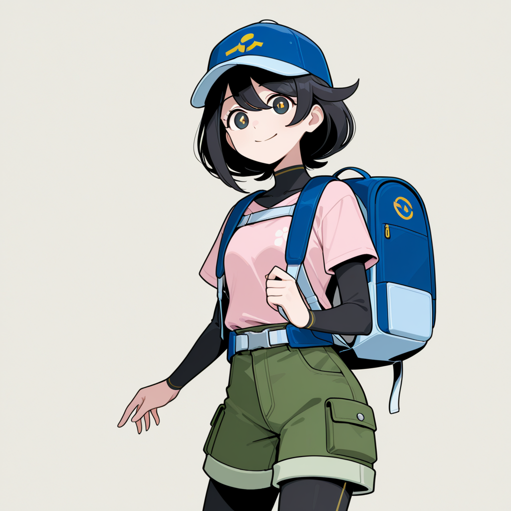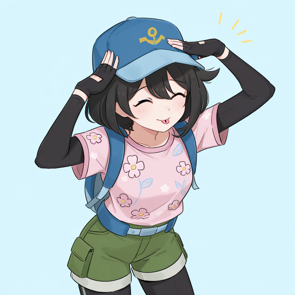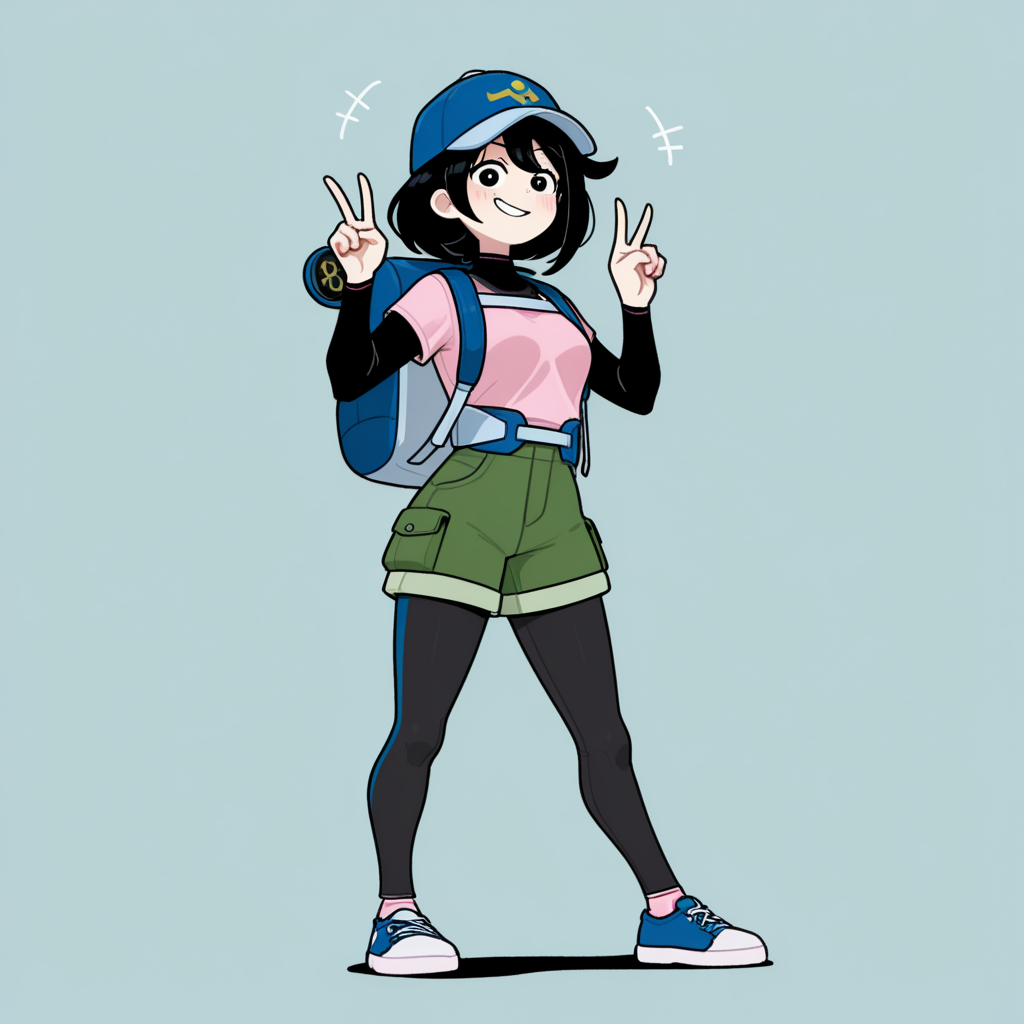 • pink shirt, blue hat, fingerless gloves, green shorts, short sleeves, leggings, black leggings, short over long sleeves, long sleeves, legwear under shorts, sneackers