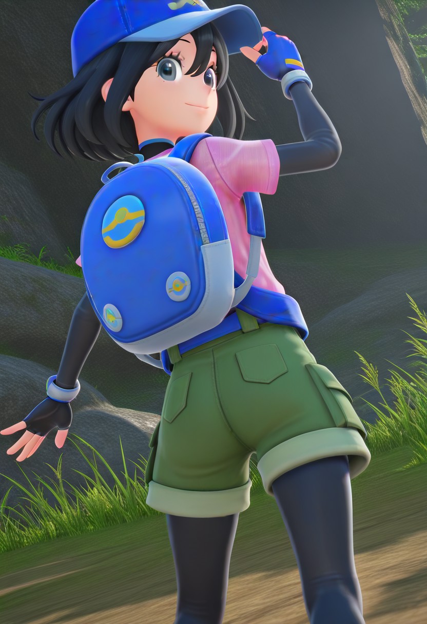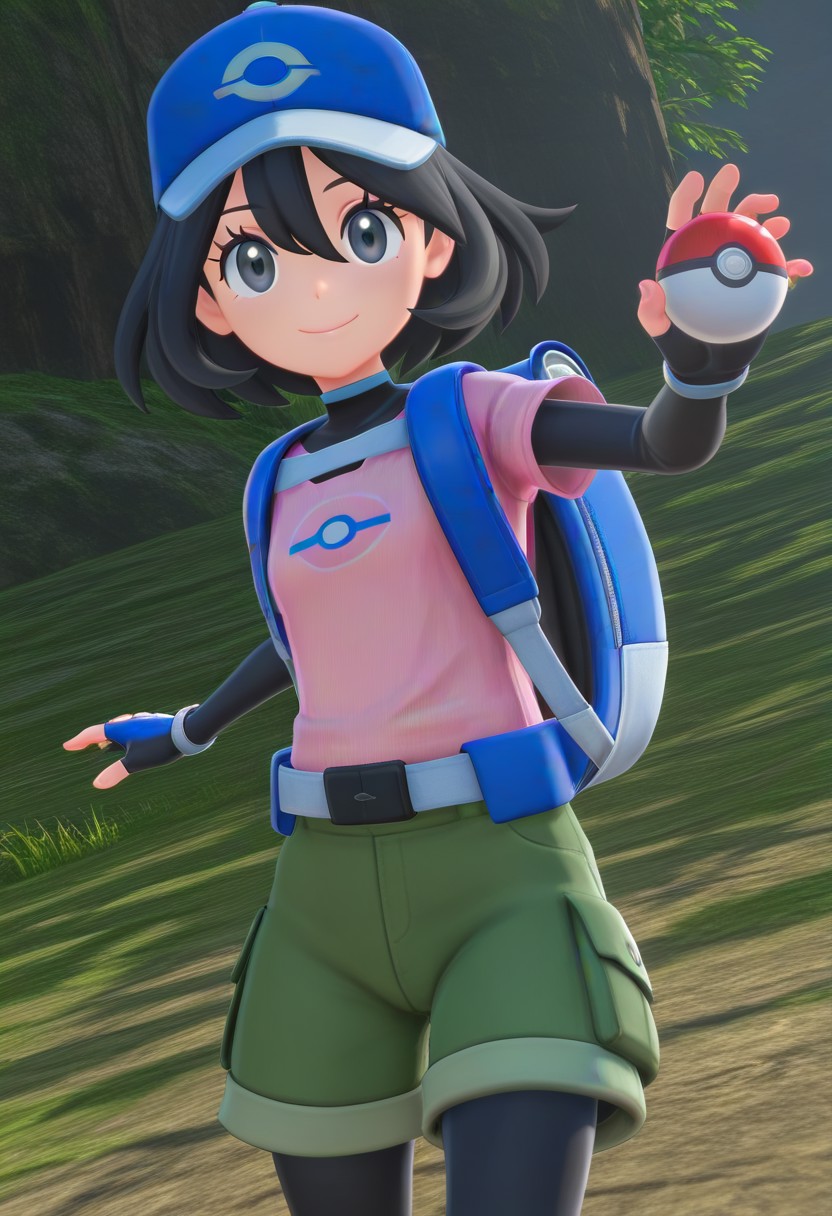 3d, 1 girl, black hair, short hair, hair between eyes, black eyes, eyelashes, blue cap, long-sleeve undershirt, pink t-shirt, blue backpack, green shorts, short shorts, black pantyhose, fingerless gloves, white and pink sneakers,poke ball